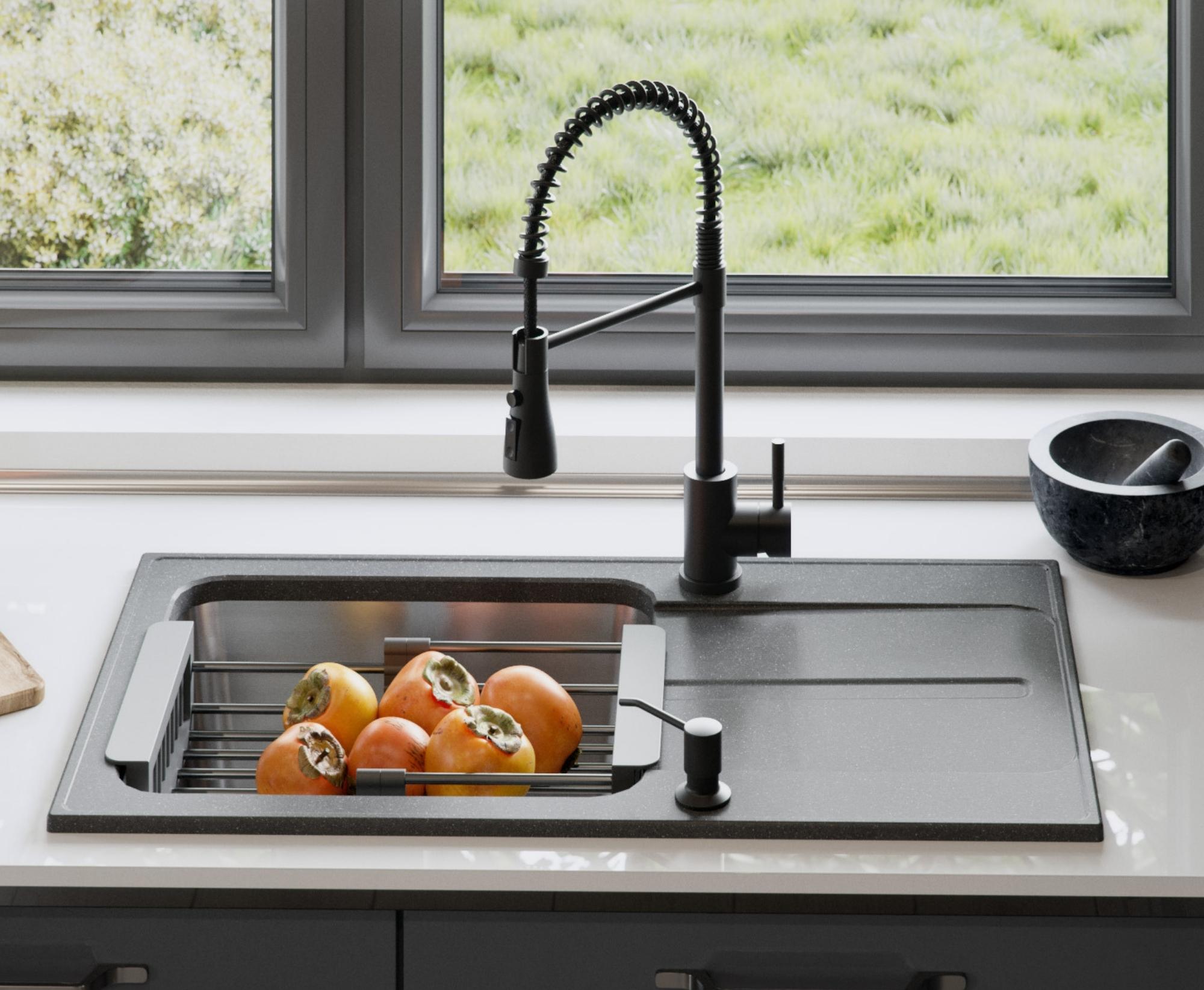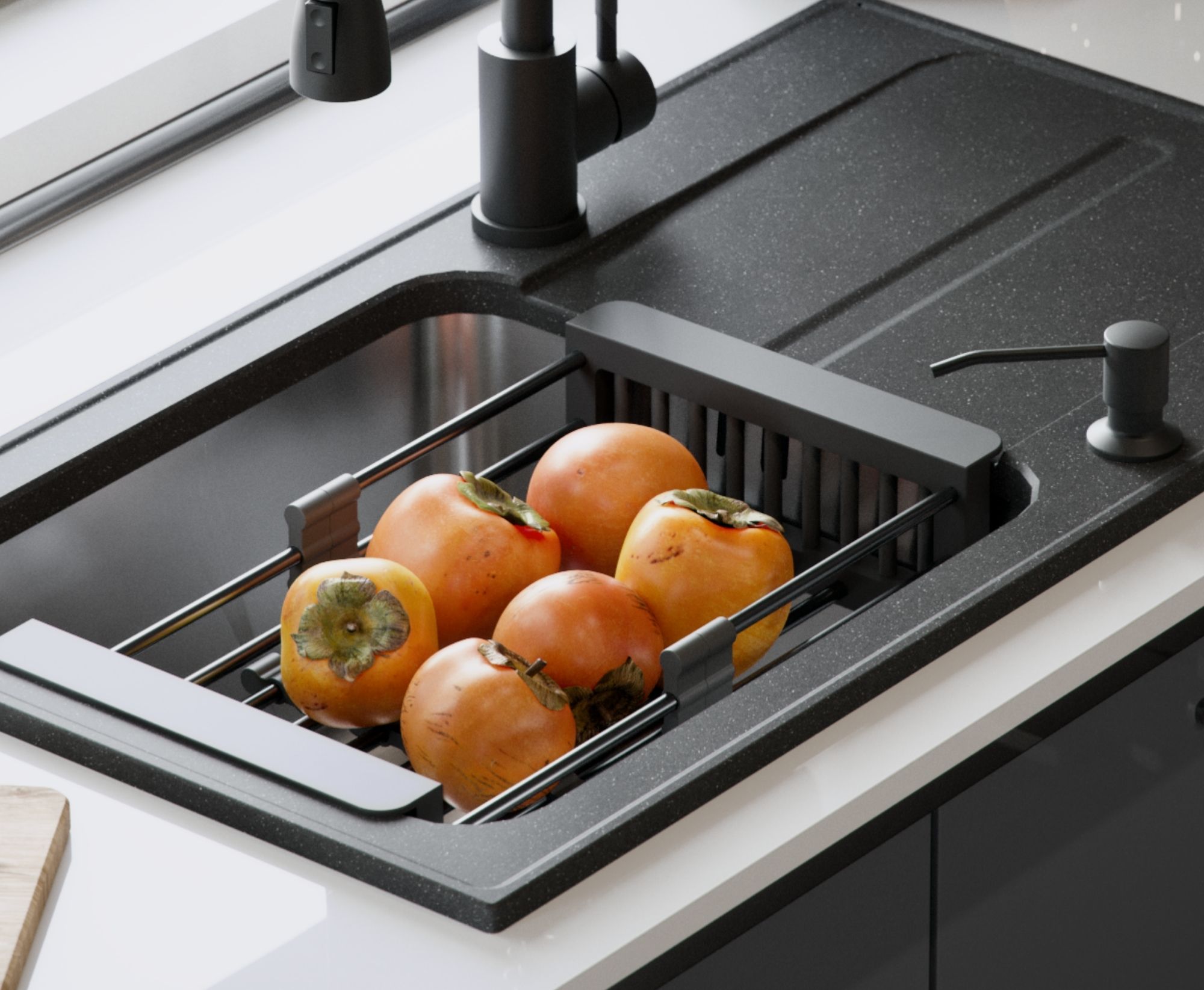 Czarne uchwyty nadają mu nowoczesnego charakteru i doskonale komponują się z ciemnymi lub kontrastowymi aranżacjami kuchennymi. To idealne rozwiązanie do codziennego mycia owoców i warzyw, a także praktyczny ociekacz do małych naczyń.