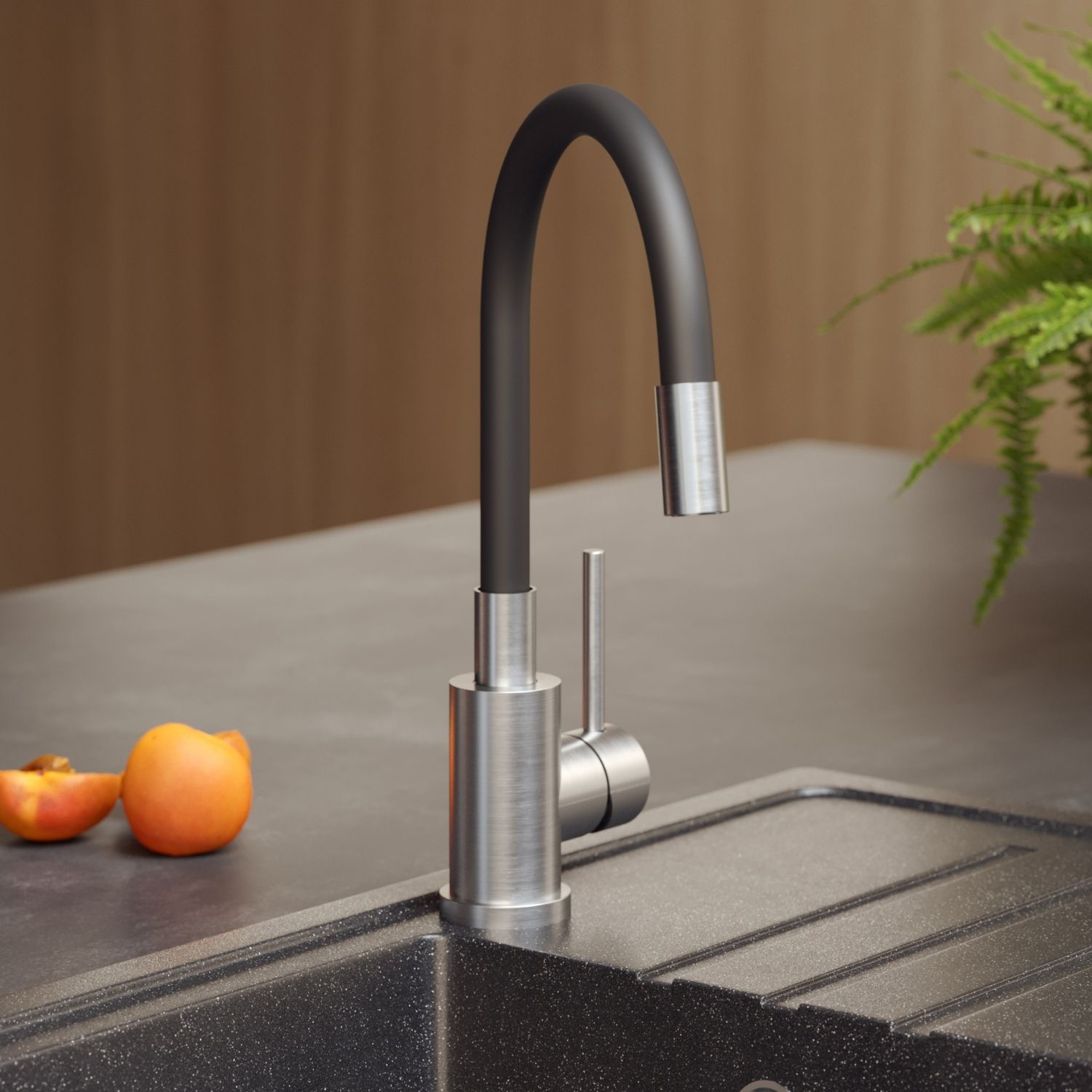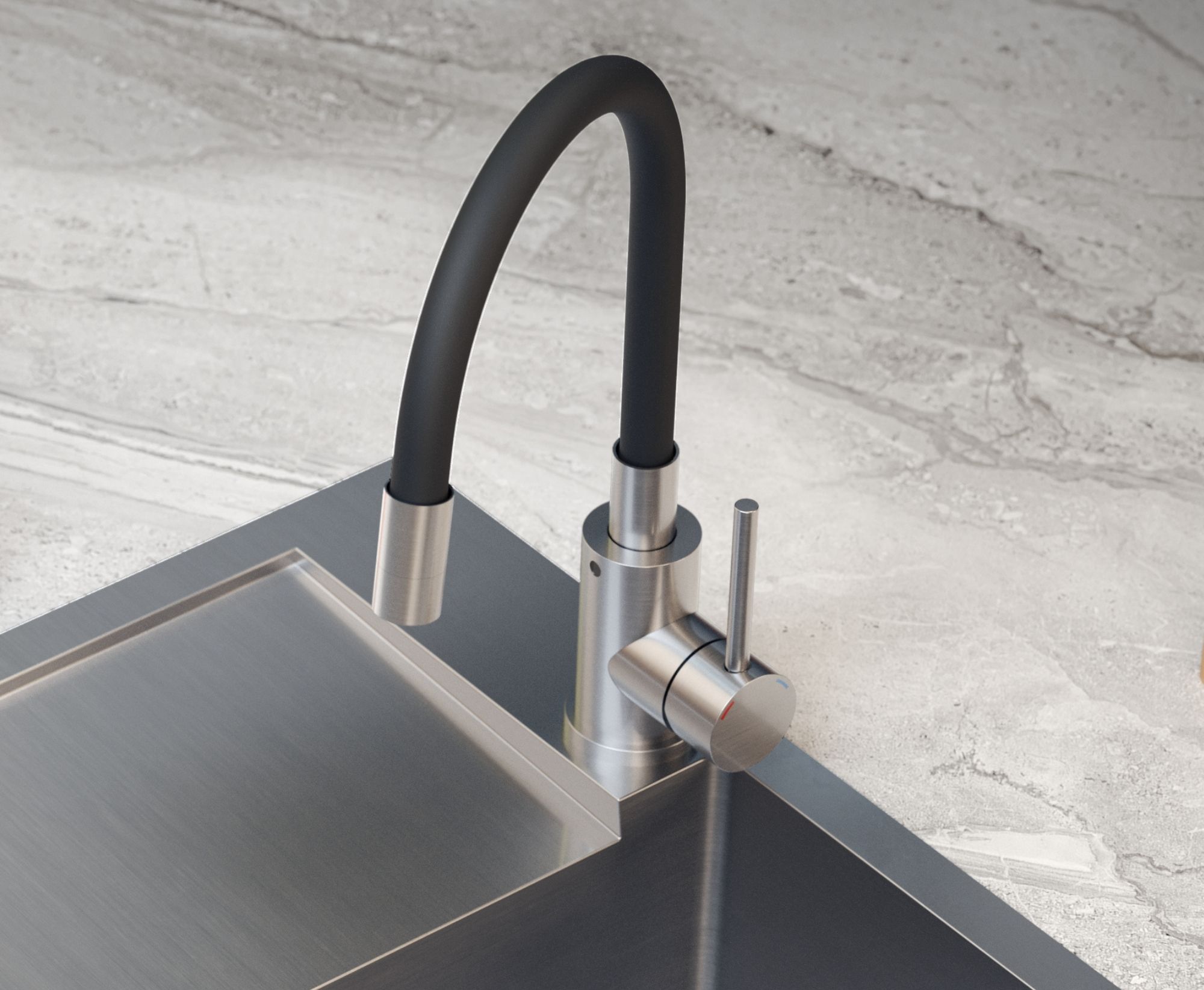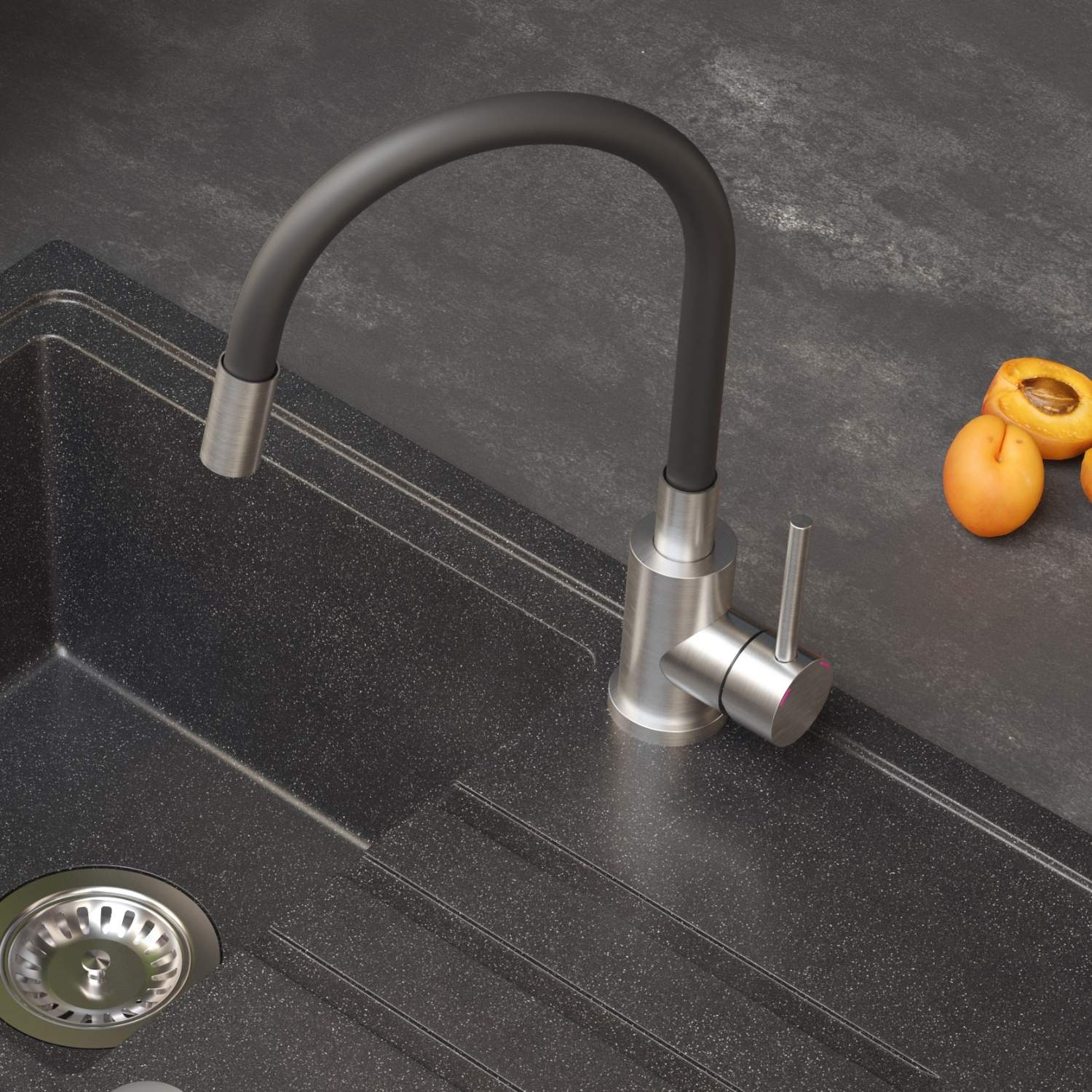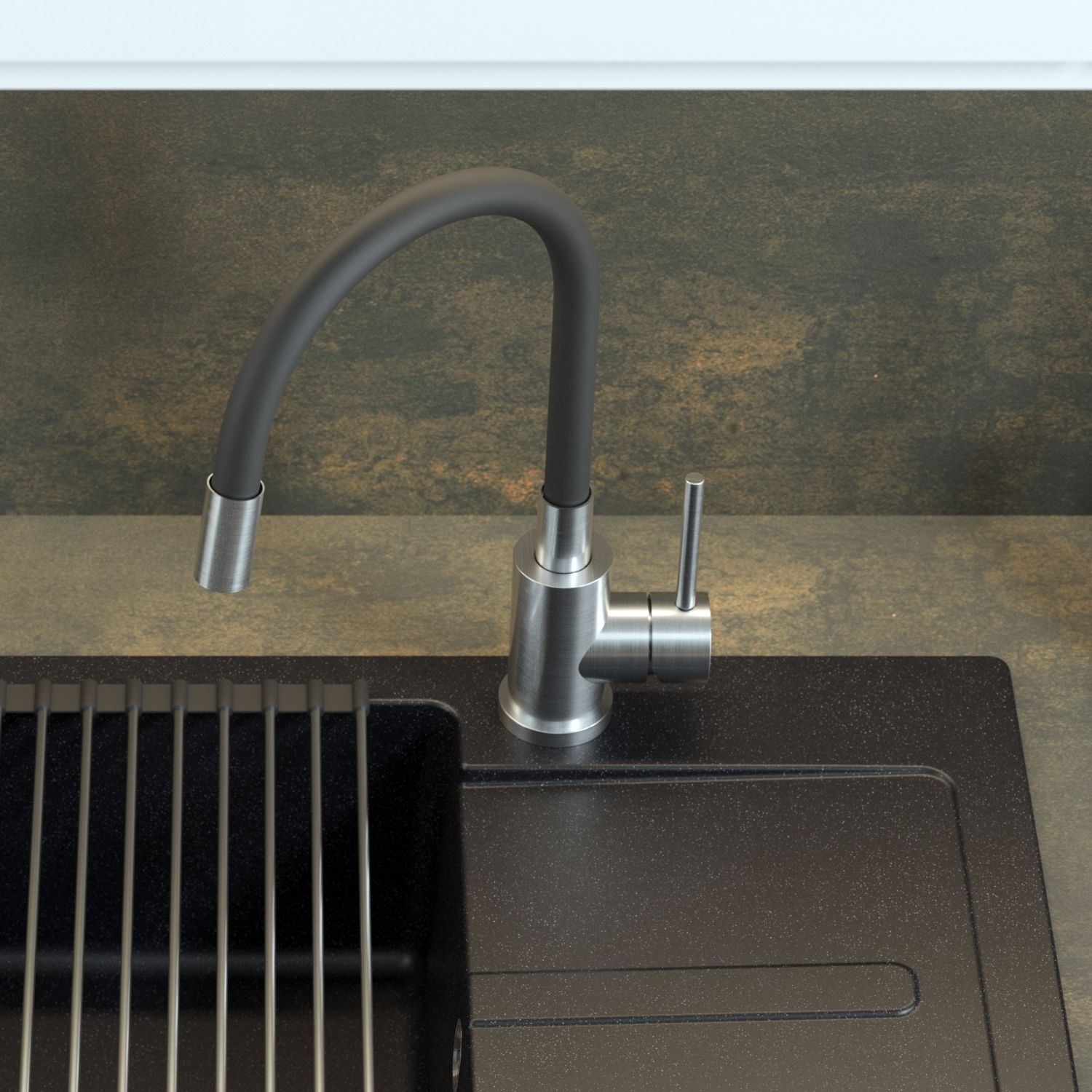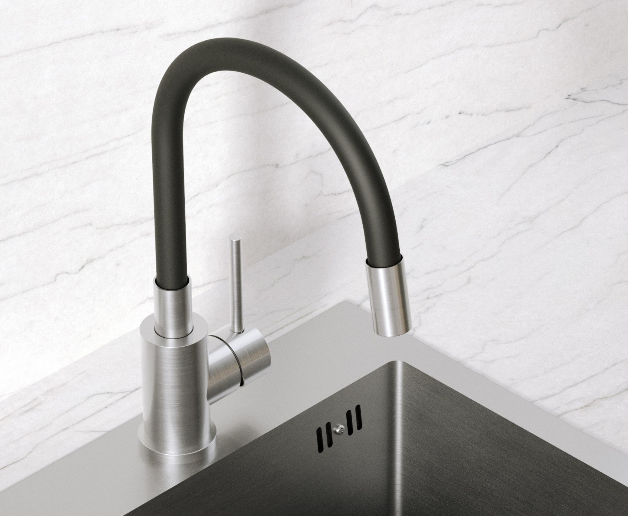 Bateria kuchenna MAGGIE – stalowa SteelQ/wąż czarny, obrotowa, elastyczna wylewka, Quadron