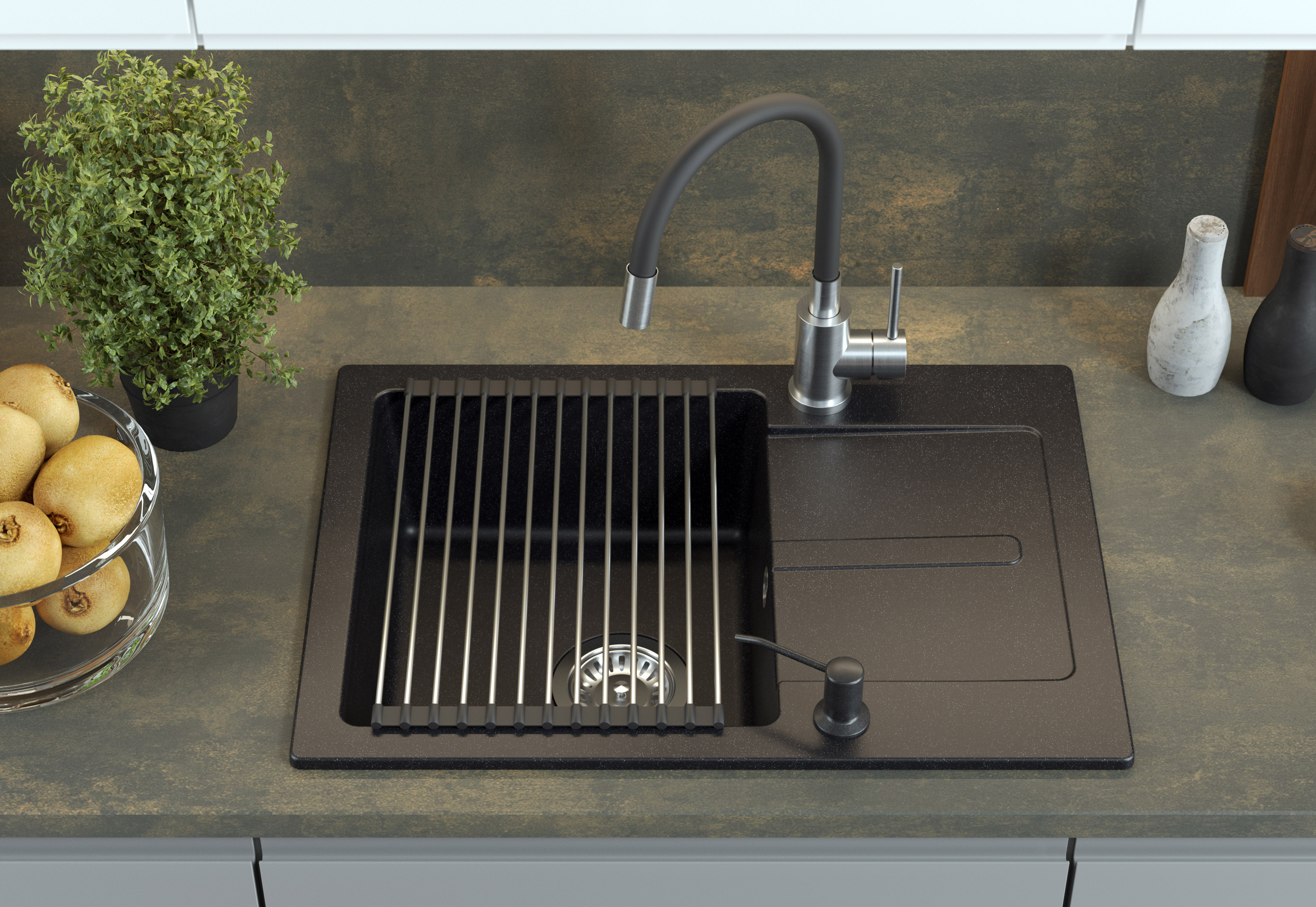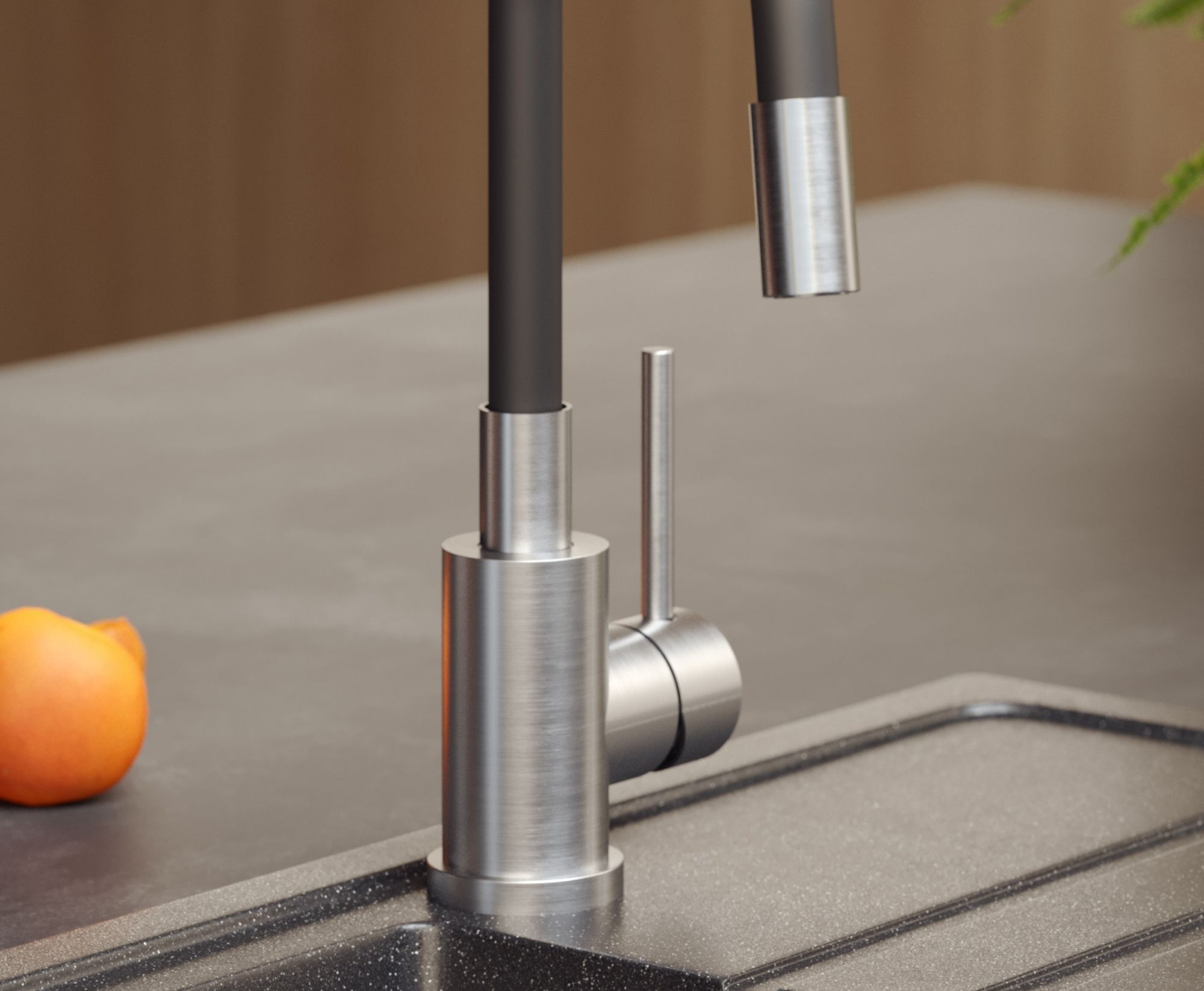 Bateria kuchenna MAGGIE w klasycznym czarnym wykończeniu łączy nowoczesny design z wszechstronną funkcjonalnością. Stalowy korpus gwarantuje odporność na korozję i codzienne zużycie, a elastyczny wąż w kolorze czarnym pozwala na precyzyjne kierowanie wodą, ułatwiając płukanie warzyw, napełnianie wysokich garnków czy mycie dużych naczyń.