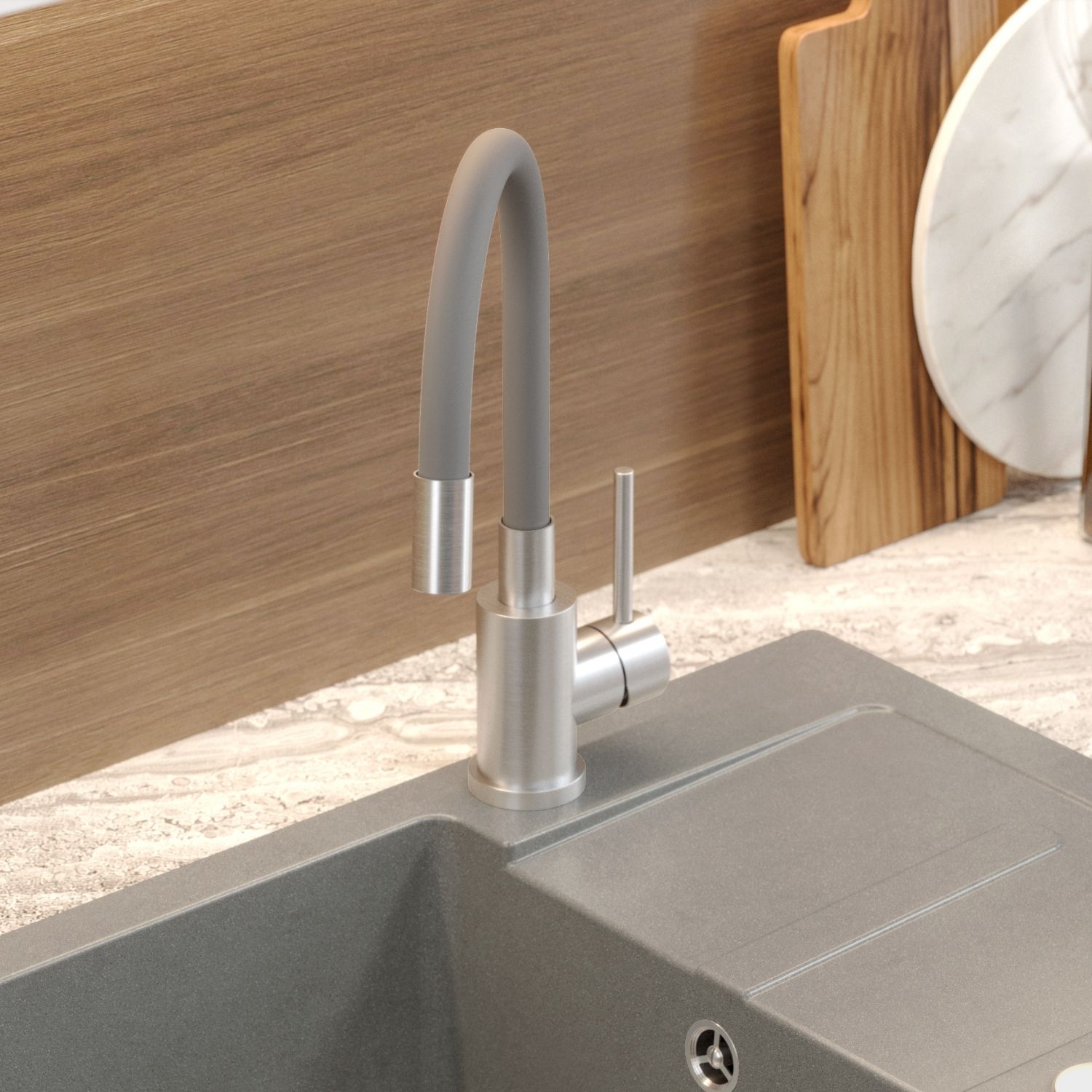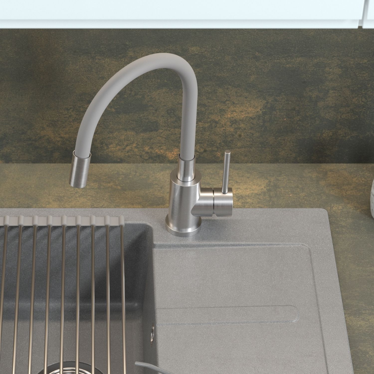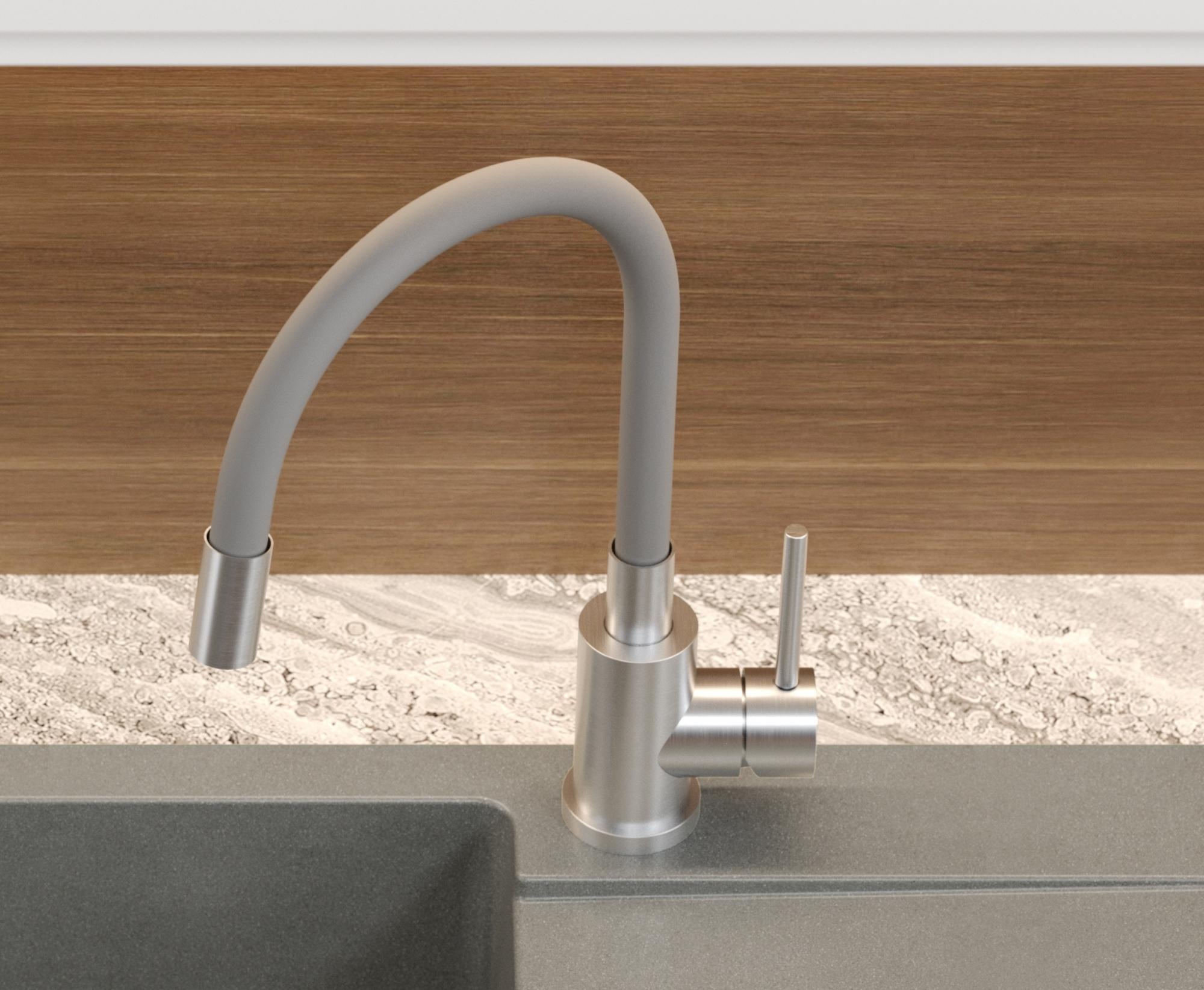 Bateria MAGGIE w odcieniu szarym to połączenie nowoczesnego stylu i wysokiej jakości wykonania. Stalowy korpus zapewnia odporność na korozję i uszkodzenia mechaniczne, a elastyczny wąż w kolorze szarym pozwala swobodnie kierować strumień wody w dowolnym kierunku, co znacząco ułatwia mycie dużych garnków i naczyń ustawionych poza komorą zlewu.