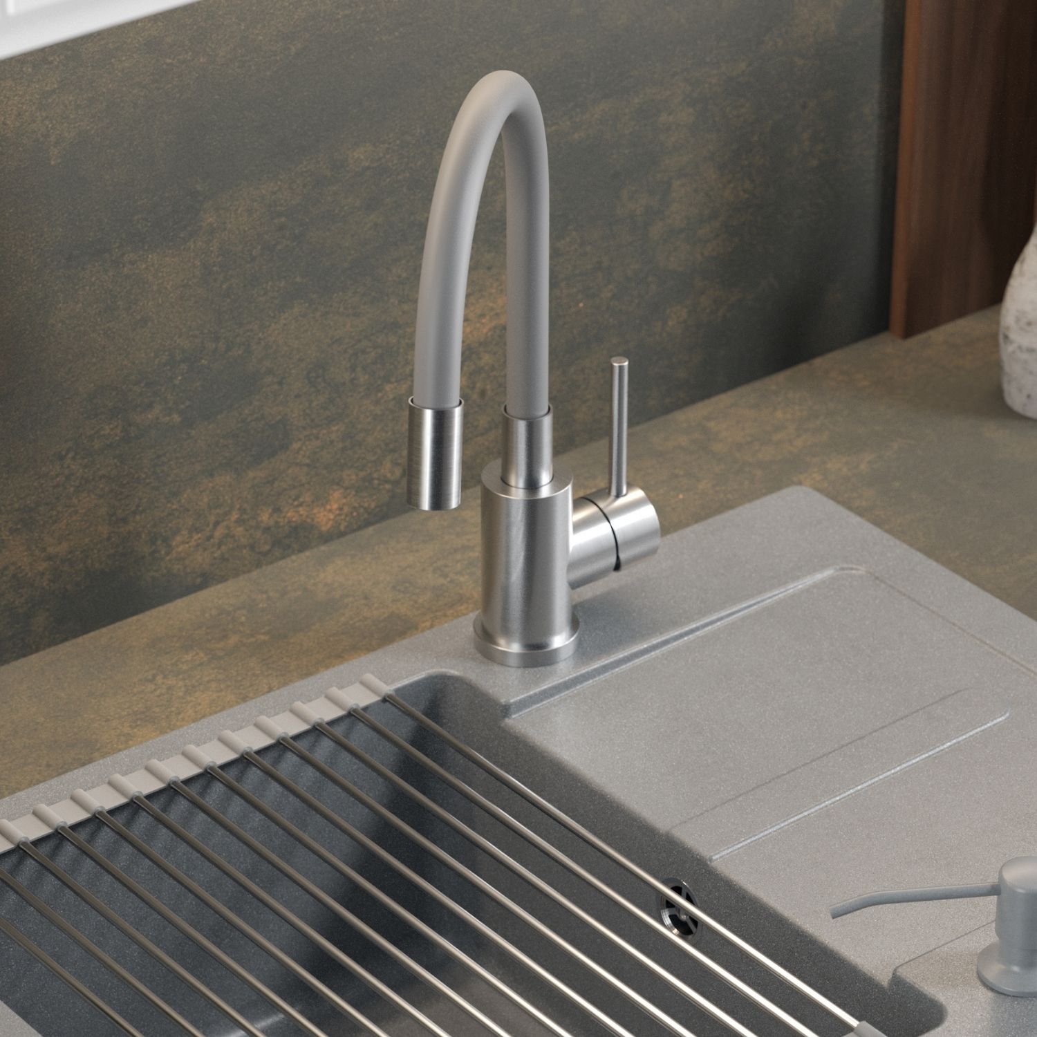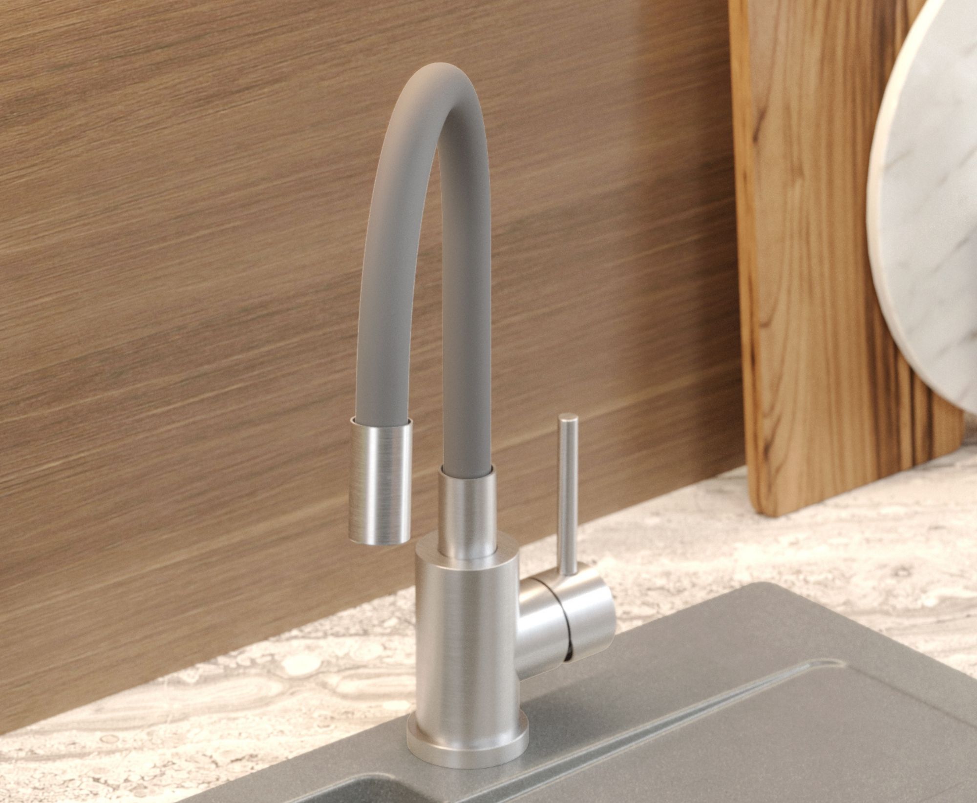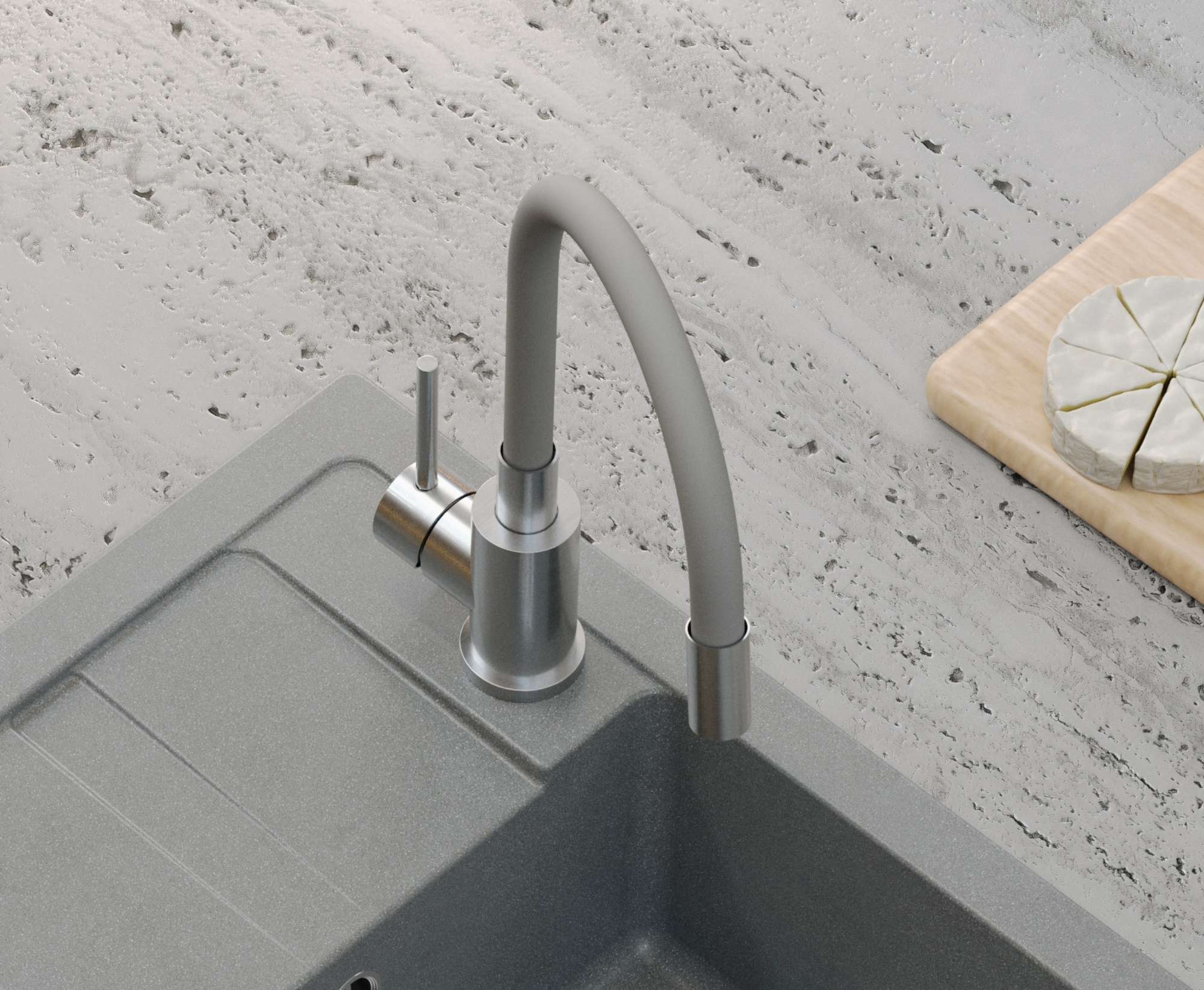 Bateria MAGGIE w odcieniu szarym to połączenie nowoczesnego stylu i wysokiej jakości wykonania. Stalowy korpus zapewnia odporność na korozję i uszkodzenia mechaniczne, a elastyczny wąż w kolorze szarym pozwala swobodnie kierować strumień wody w dowolnym kierunku, co znacząco ułatwia mycie dużych garnków i naczyń ustawionych poza komorą zlewu.