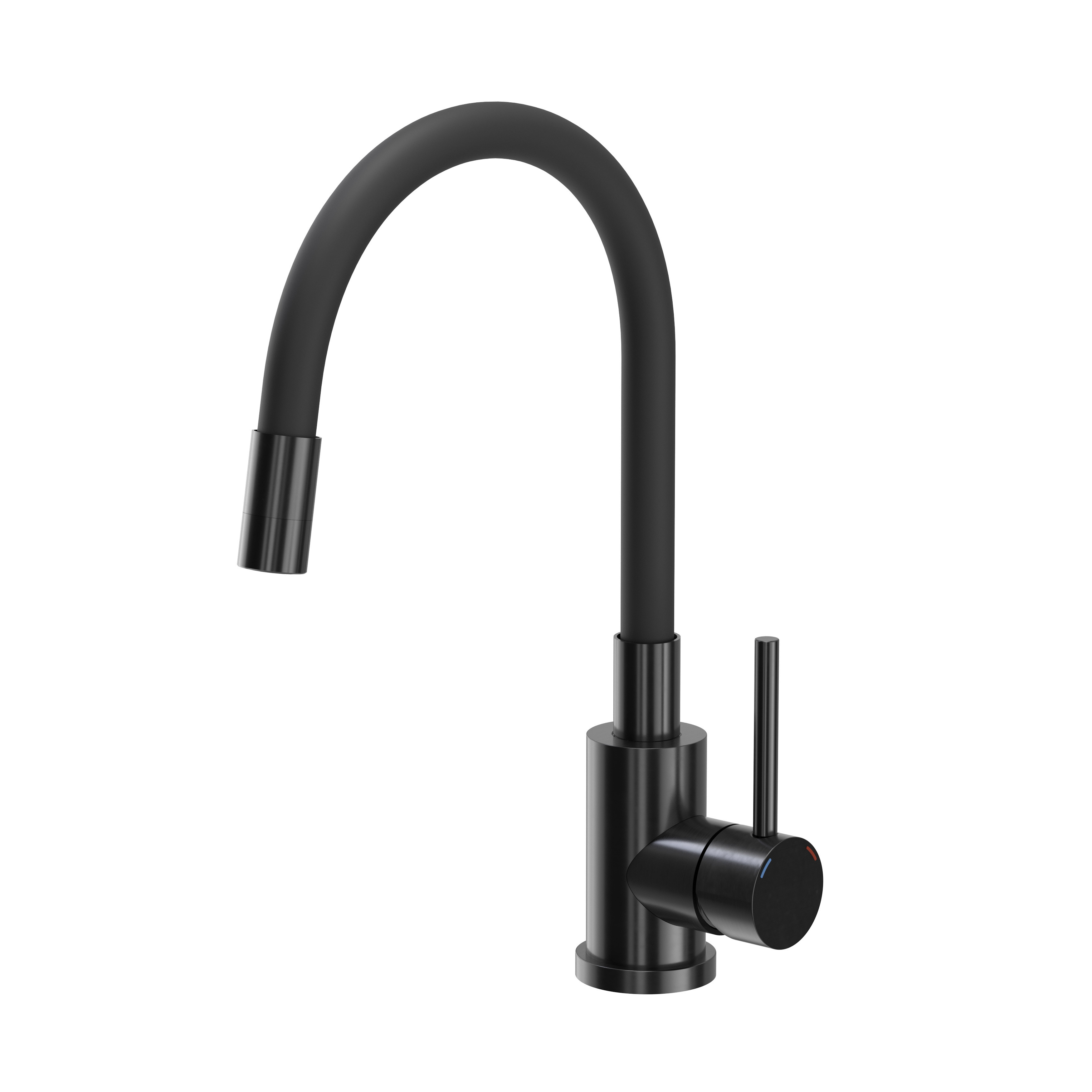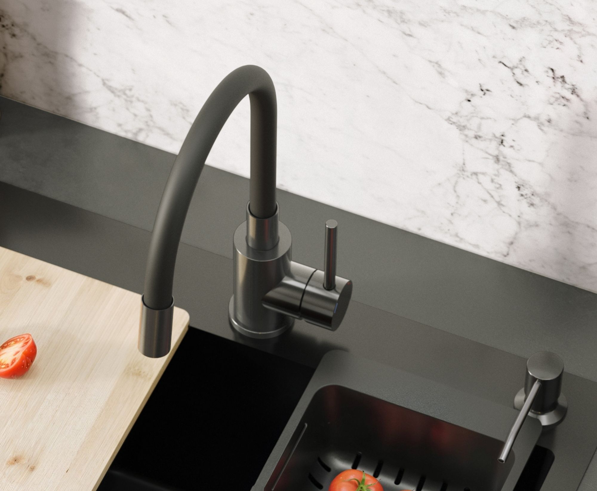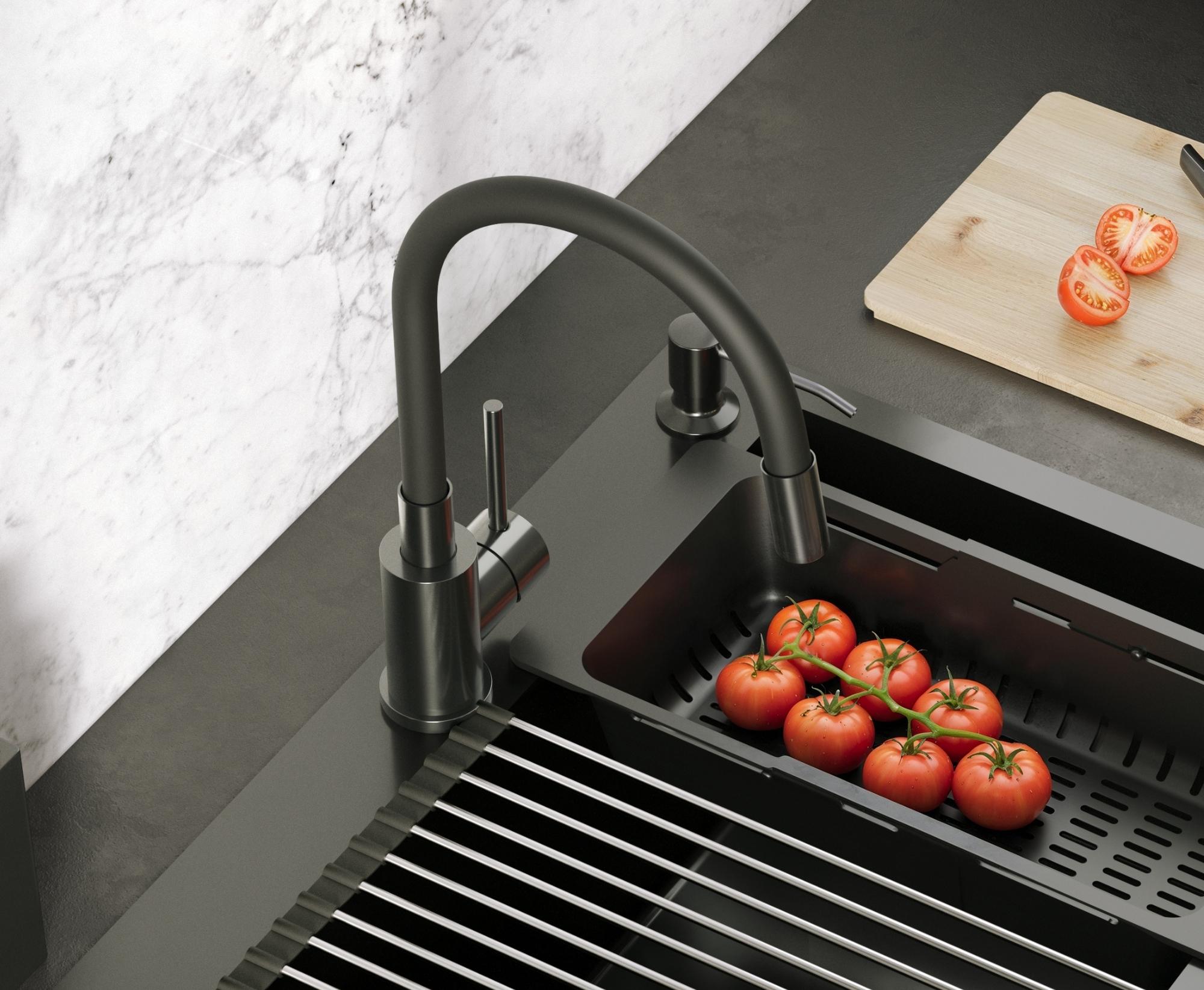 Bateria kuchenna MAGGIE w wykończeniu nano PVD black metal łączy nowoczesną estetykę z maksymalną funkcjonalnością. Stalowy korpus w eleganckim czarnym odcieniu połączony z czarną, elastyczną wylewką zapewnia trwałość, odporność na korozję oraz codzienne zużycie, a jednocześnie tworzy designerski, spójny wygląd kuchni. Elastyczność i wytrzymałość wylewki pozwala swobodnie kierować strumieniem wody, co ułatwia mycie dużych garnków, naczyń i płukanie warzyw także poza obrębem zlewozmywaka.