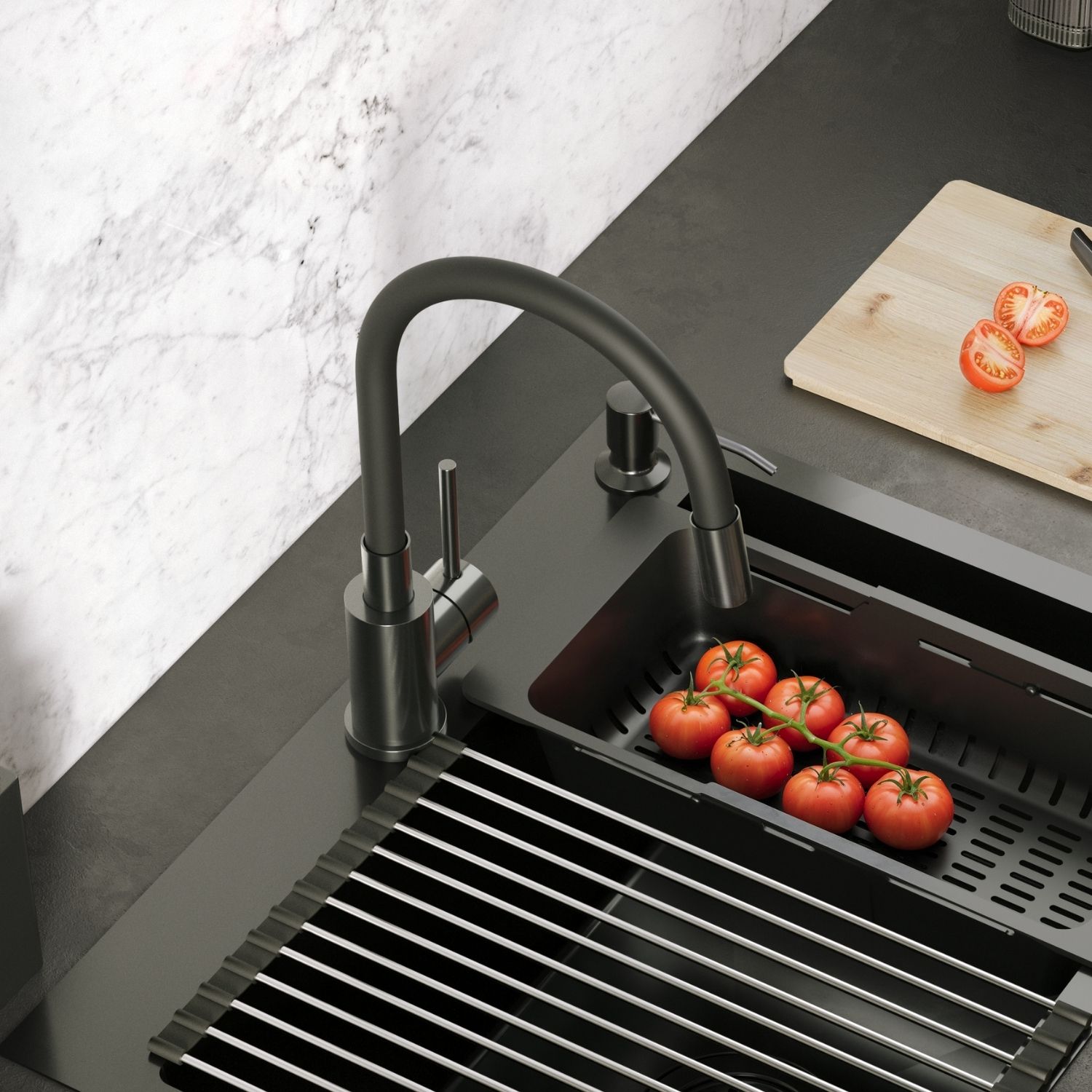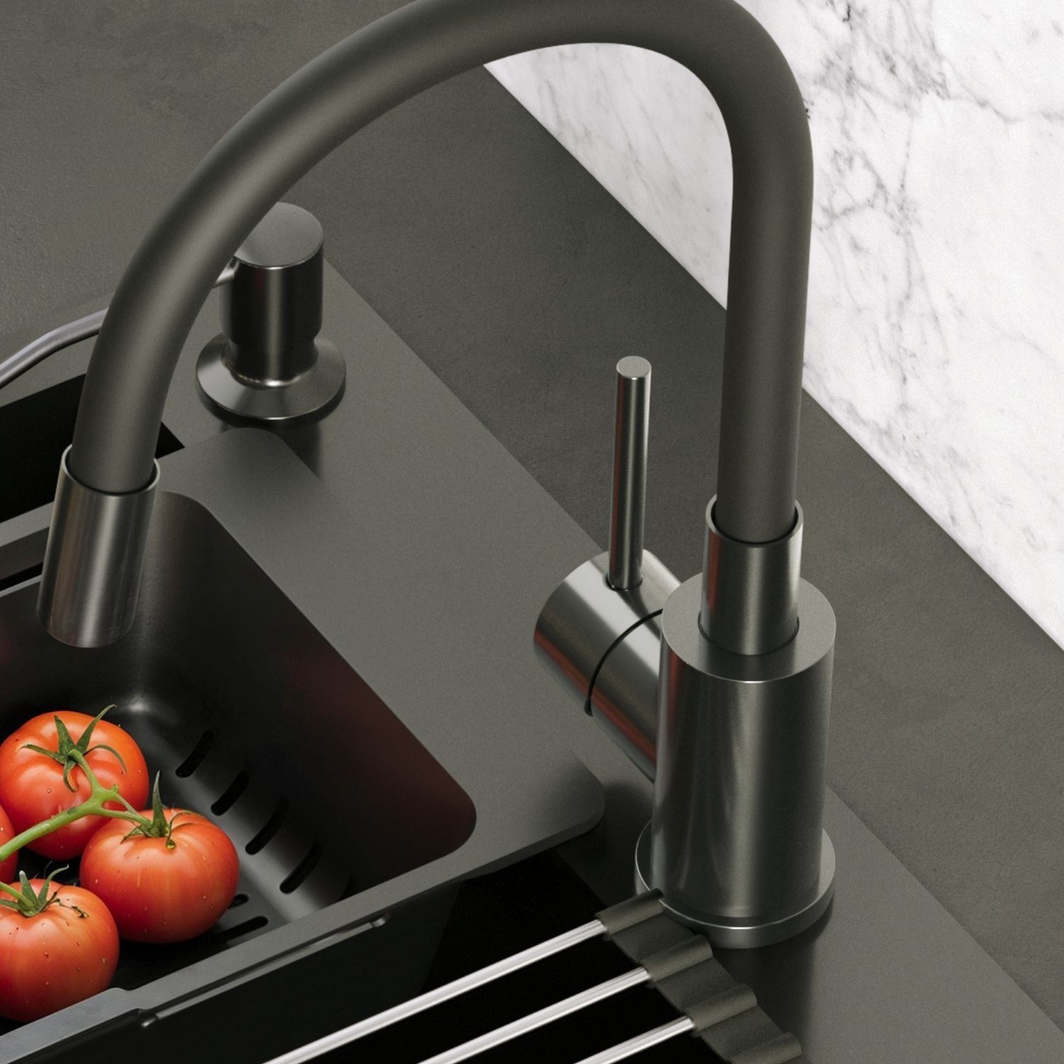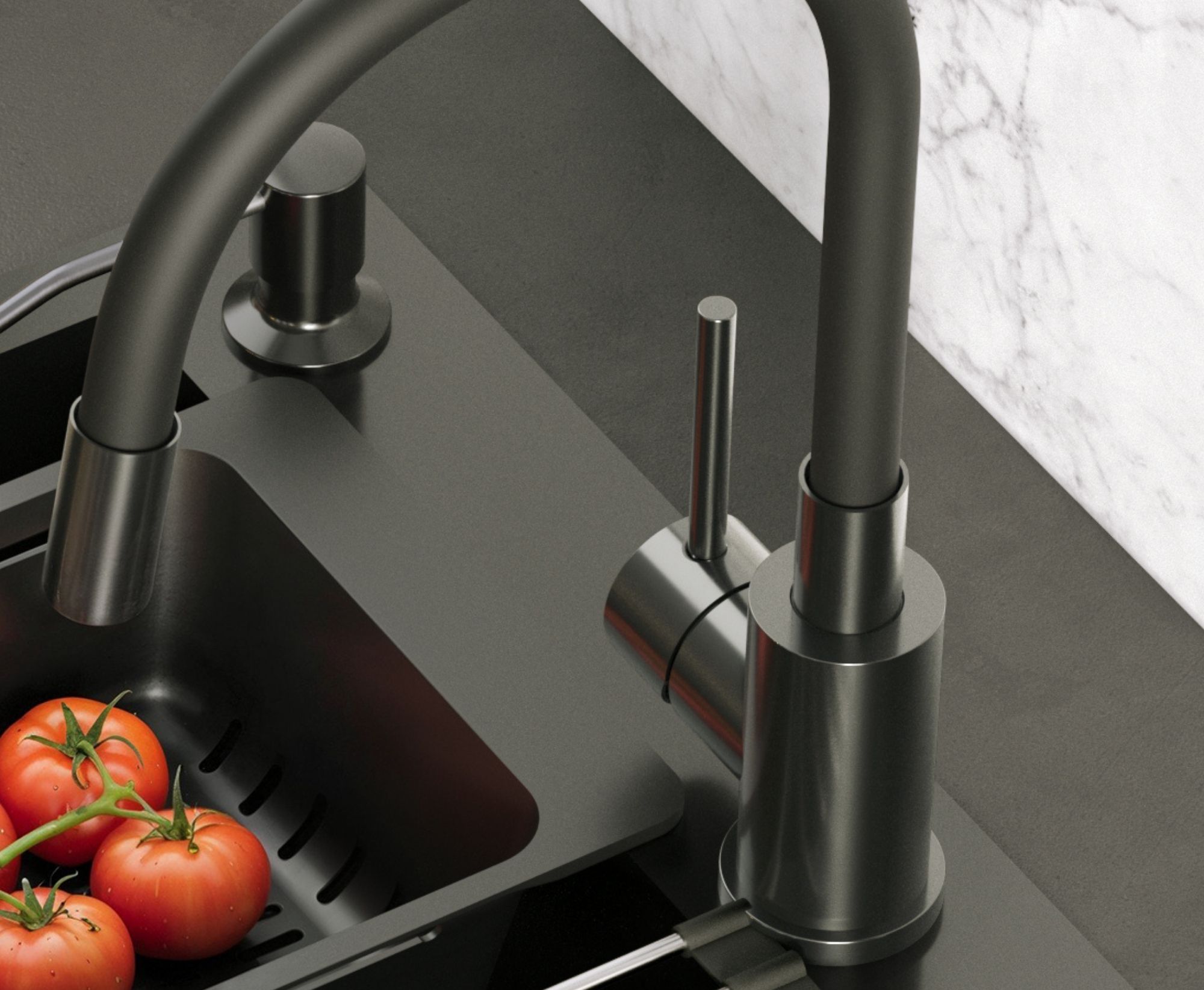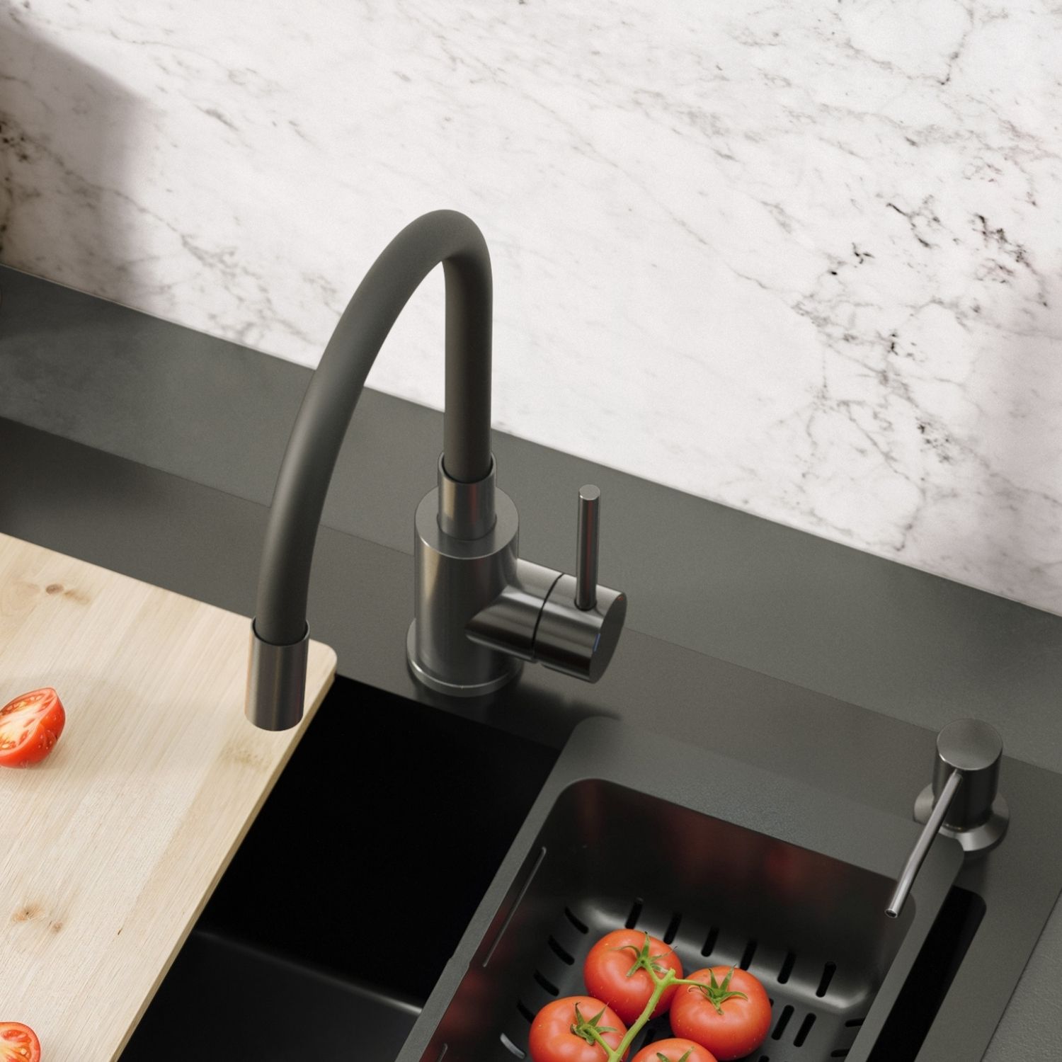 Bateria kuchenna MAGGIE w wykończeniu nano PVD black metal łączy nowoczesną estetykę z maksymalną funkcjonalnością. Stalowy korpus w eleganckim czarnym odcieniu połączony z czarną, elastyczną wylewką zapewnia trwałość, odporność na korozję oraz codzienne zużycie, a jednocześnie tworzy designerski, spójny wygląd kuchni. Elastyczność i wytrzymałość wylewki pozwala swobodnie kierować strumieniem wody, co ułatwia mycie dużych garnków, naczyń i płukanie warzyw także poza obrębem zlewozmywaka.