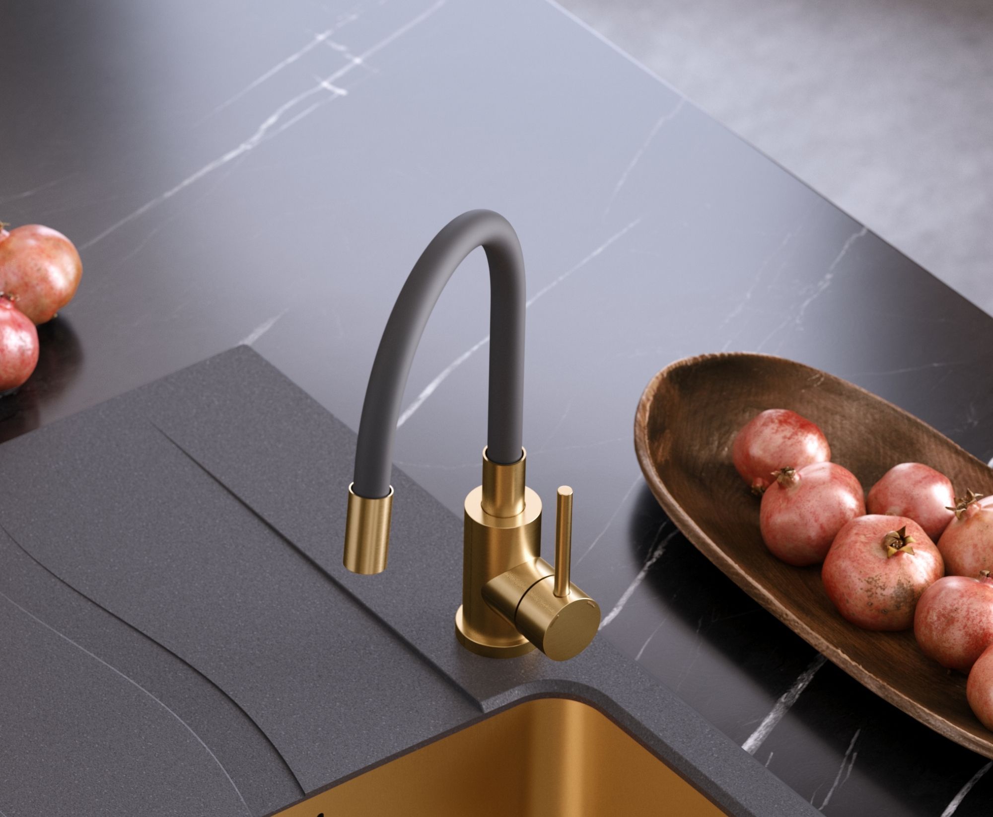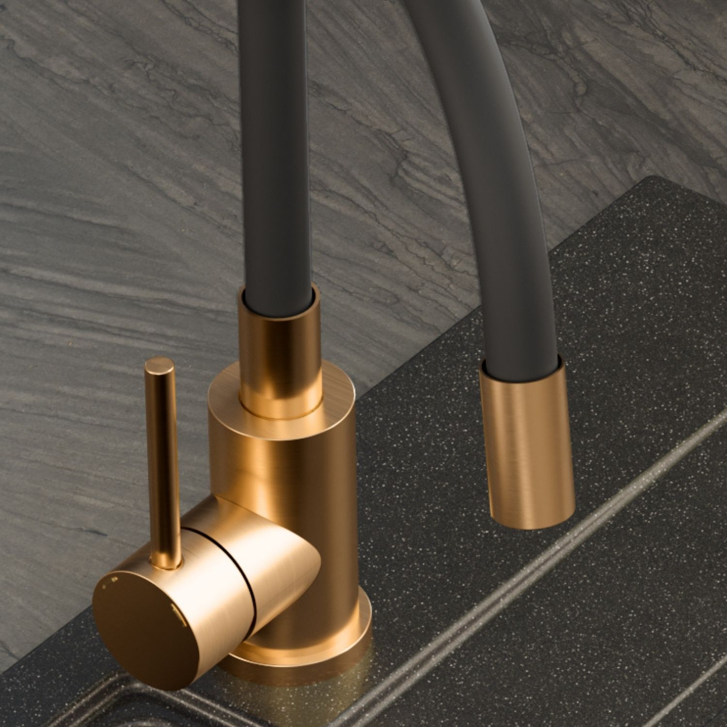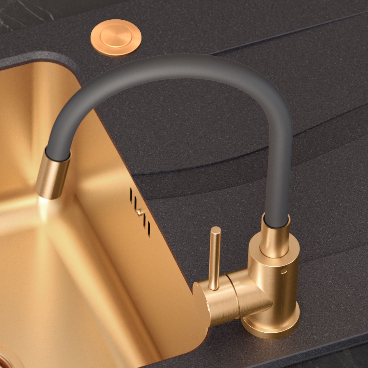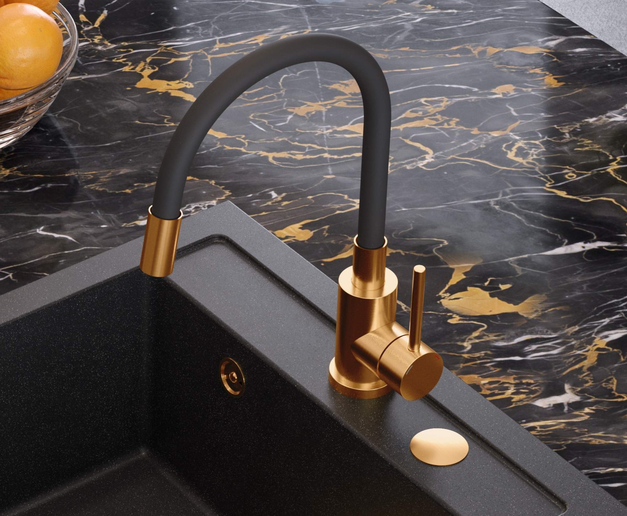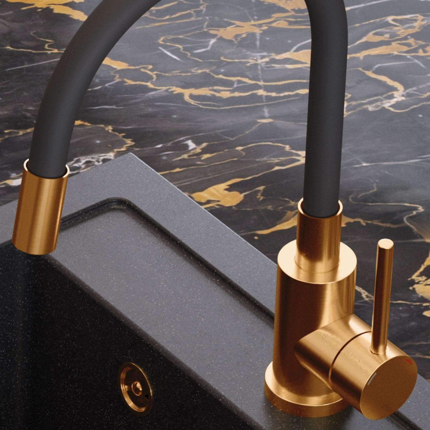 Bateria kuchenna MAGGIE w wykończeniu nano PVD miedź to elegancka i funkcjonalna propozycja do nowoczesnej kuchni. Stalowy korpus w złocistym, miedzianym odcieniu kontrastuje z elastycznym, czarnym wężem, tworząc efektowny i spójny wygląd. Elastyczna wylewka pozwala na swobodne kierowanie strumieniem wody w dowolnym kierunku, co ułatwia mycie dużych naczyń i płukanie warzyw poza komorą zlewu.