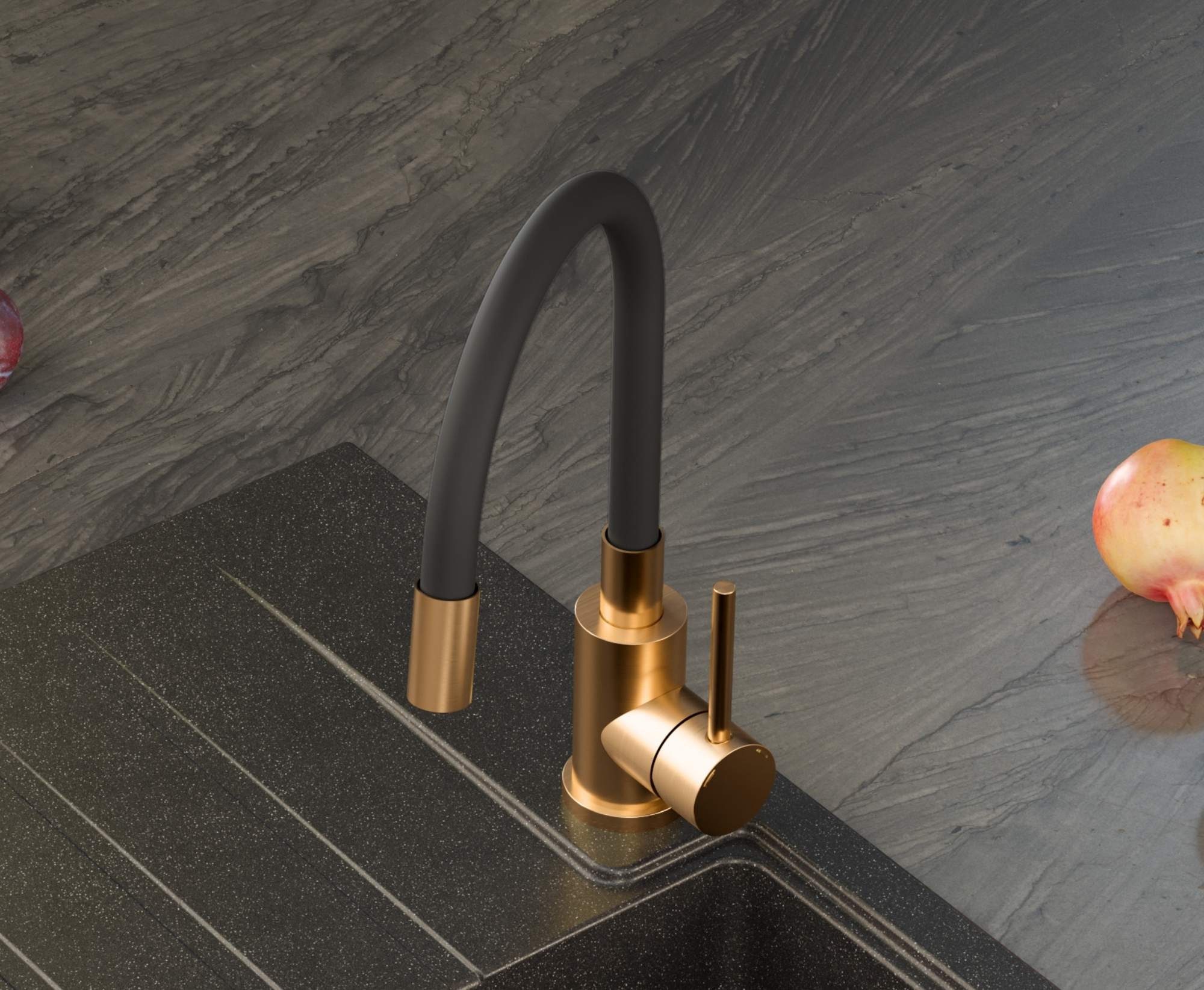 Bateria kuchenna MAGGIE – stalowa, miedziany nano PVD/wąż czarny, obrotowa, elastyczna wylewka, Quadron