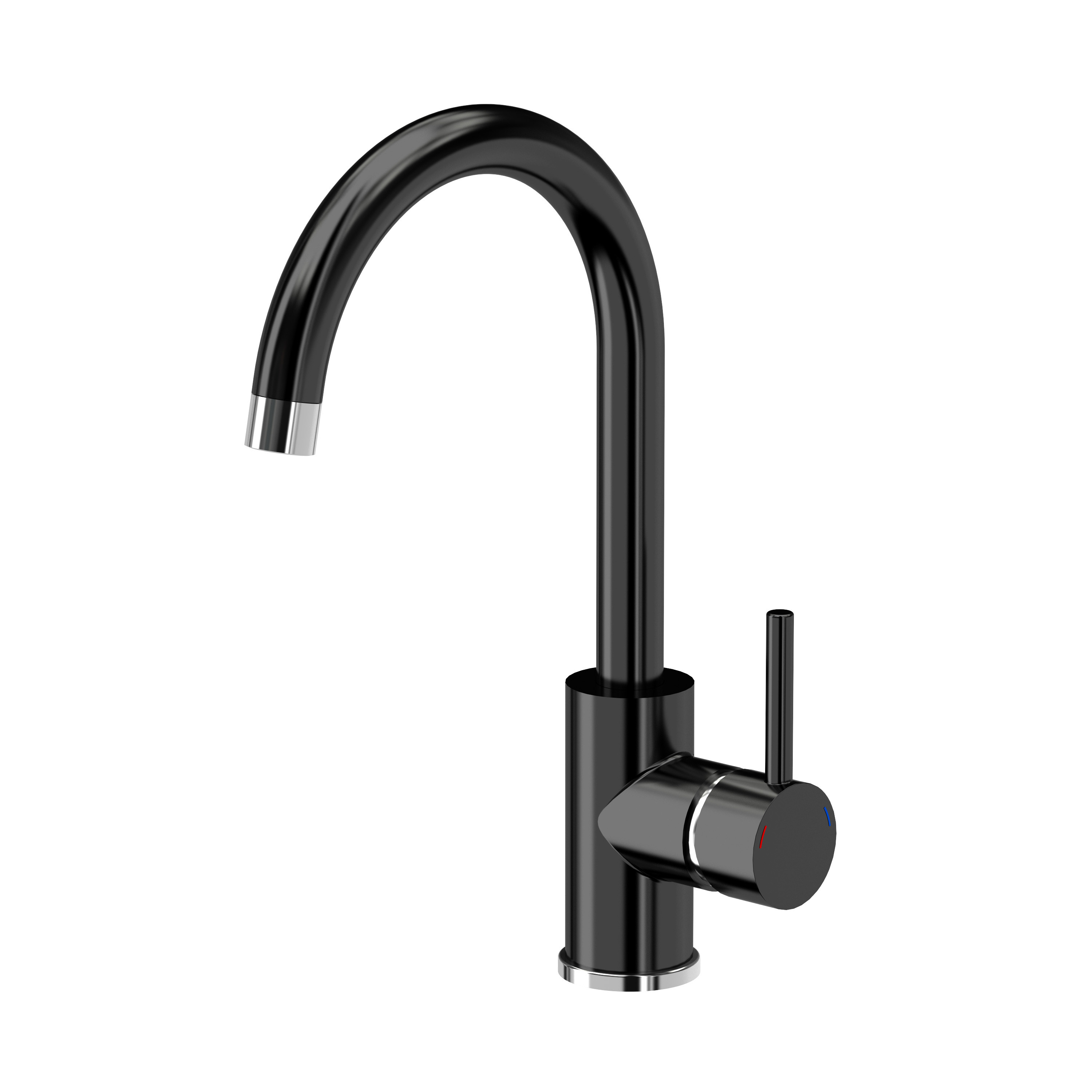 Bateria kuchenna NAOMI w eleganckim wykończeniu czarny połysk to połączenie klasyki i nowoczesnej funkcjonalności. Jej stalowy korpus o gładkiej, lśniącej powierzchni stanowi stylowy, biżuteryjny akcent w każdej kuchni. Stała, obrotowa wylewka 360° umożliwia swobodne kierowanie strumieniem wody zarówno w obrębie komór zlewu, jak i poza nimi, co znacznie ułatwia mycie dużych garnków, naczyń czy płukanie warzyw i owoców.