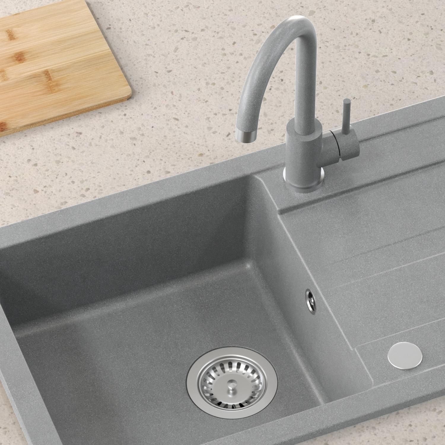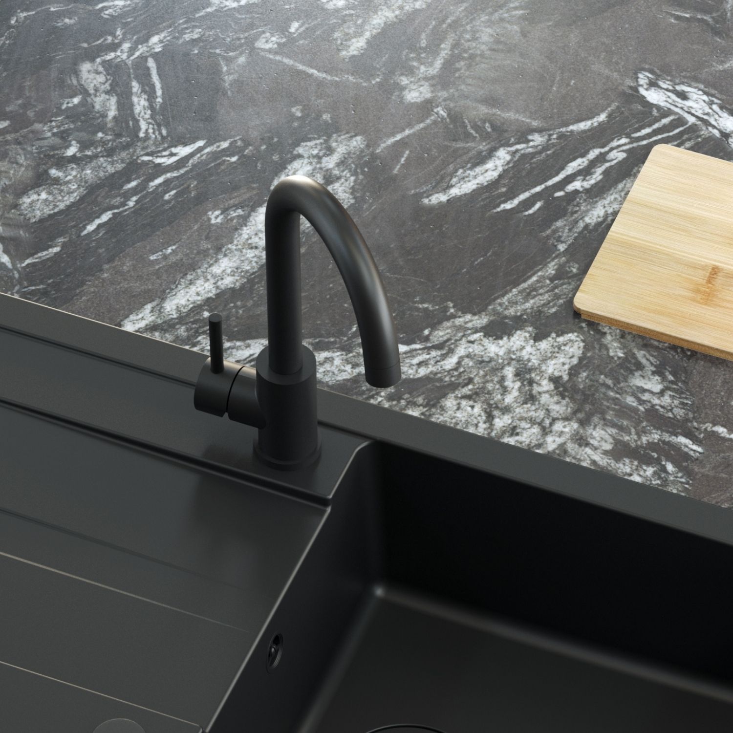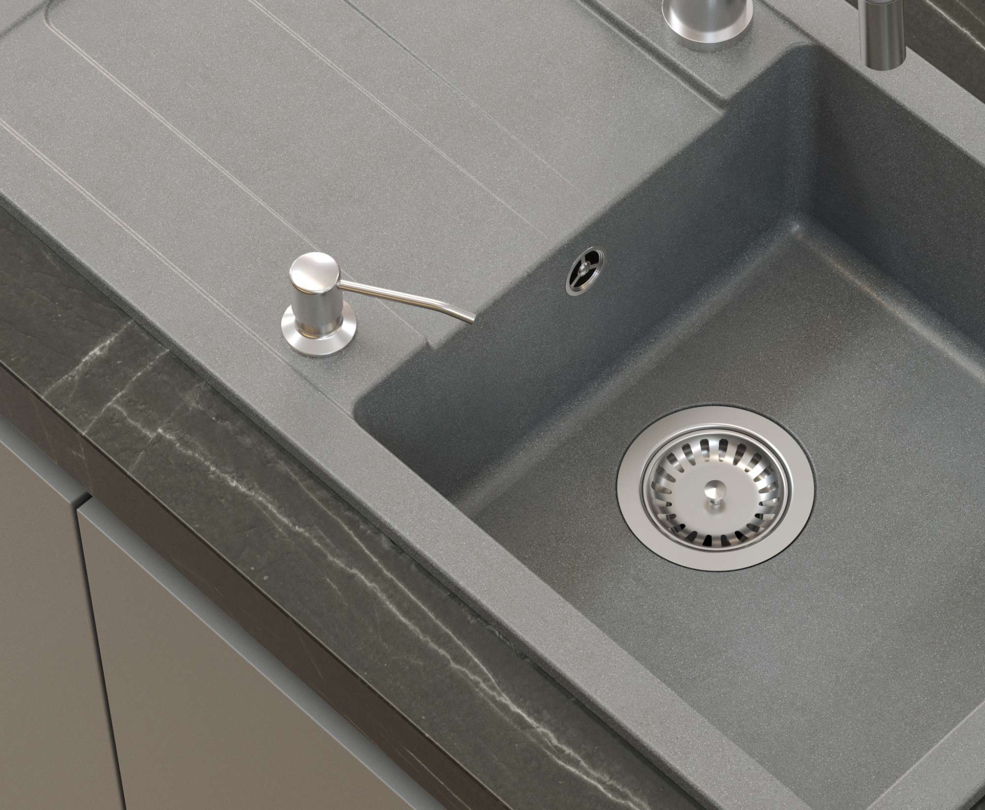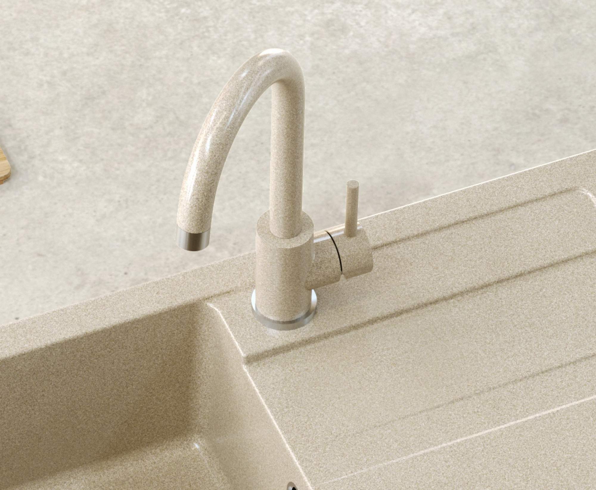 Komplet uzupełnia bateria kuchenna w kolorze dopasowanym do zlewozmywaka. Jej smukła forma podkreśla nowoczesny charakter kuchni, a solidny korpus ze stali nierdzewnej zapewnia trwałość i odporność na codzienne użytkowanie. Obrotowa wylewka 360° gwarantuje swobodę pracy, ułatwiając mycie dużych naczyń i płukanie produktów spożywczych. Ceramiczna głowica umożliwia płynną regulację temperatury i ciśnienia wody, natomiast perlator ogranicza jej zużycie, zapewniając komfortowy, miękki strumień. Dzięki systemowi QFix montaż baterii jest szybki i wygodny, bez potrzeby stosowania dodatkowych narzędzi.