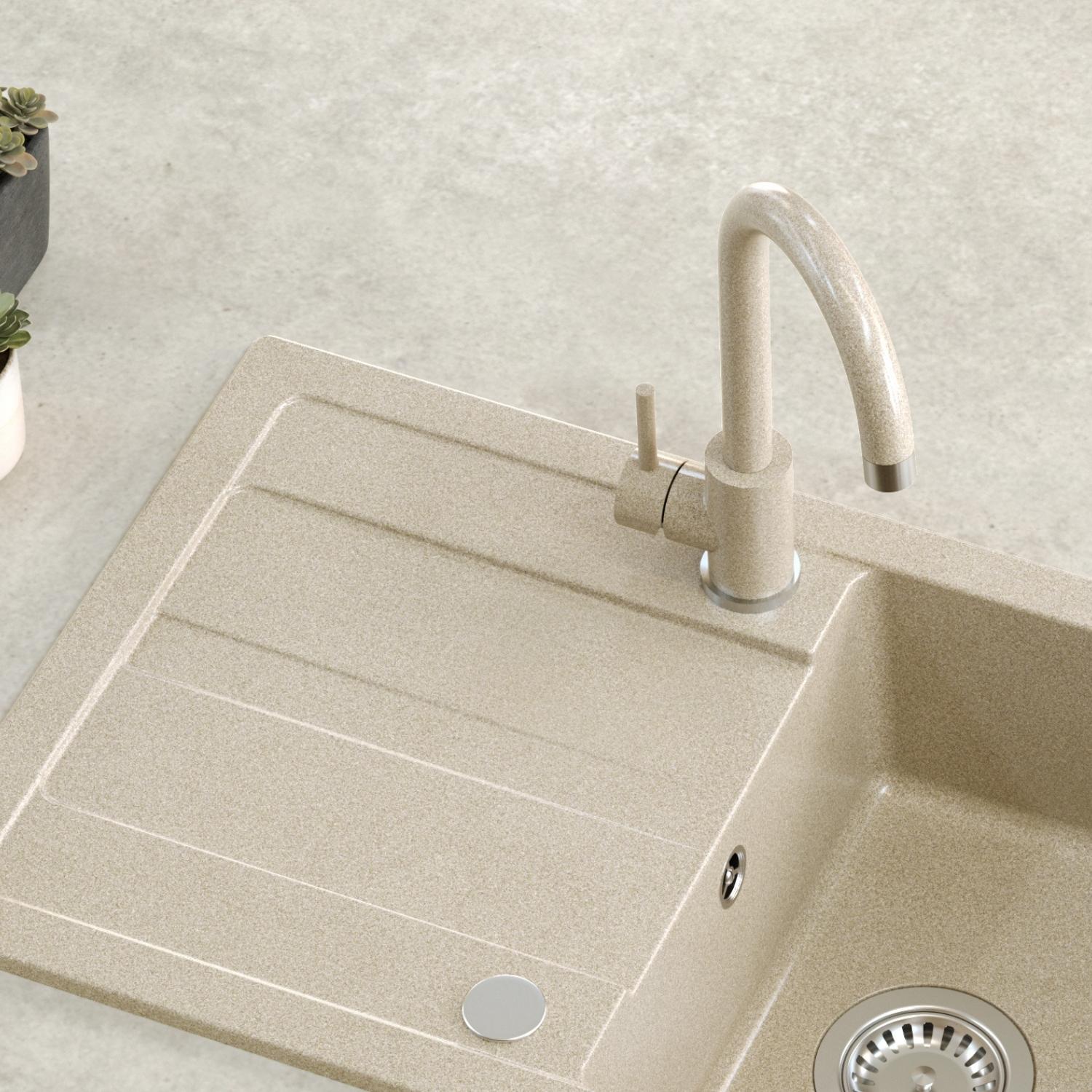 Zestaw GO-MAX zlewozmywak granitowy z baterią i deską – jednokomorowy, wpuszczany, beżowy/elementy stalowe, bateria w kolorze, deska bambusowa, Quadron
