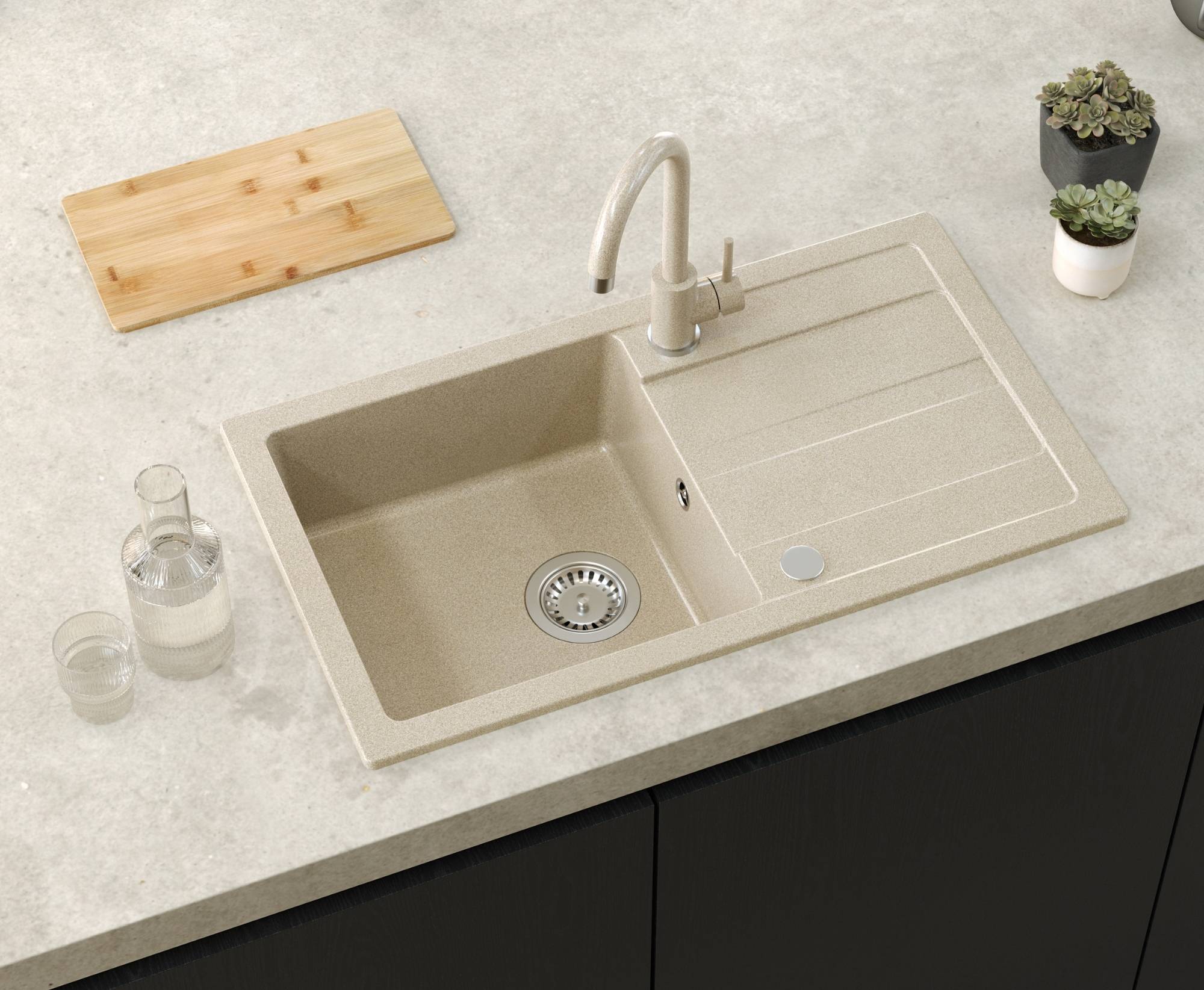 GO-MAX BEŻOWY to praktyczny i elegancki komplet do kuchni, który zapewnia funkcjonalność, trwałość i spójny design. W zestawie znajdują się: jednokomorowy zlewozmywak granitowy z ociekaczem, bateria w kolorze zlewozmywaka, syfon manualny typu save space z dekoracyjną zaślepką oraz deska bambusowa. Dzięki takiemu rozwiązaniu cała strefa zmywania jest gotowa do montażu i użytkowania od razu po zakupie, a wszystkie elementy zestawu idealnie się ze sobą komponują. Zlewozmywak wykonano z wysokiej jakości kompozytu granitowego, który łączy naturalną twardość minerałów z nowoczesnymi spoiwami.