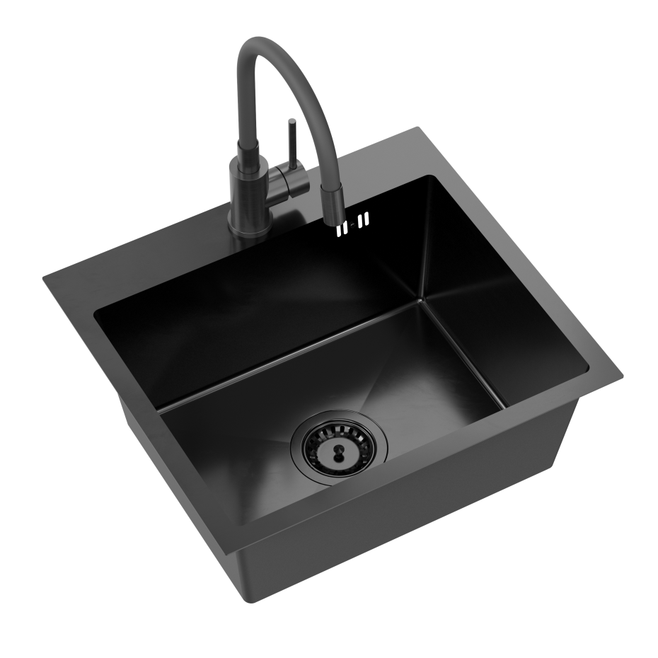 Zlewozmywak stalowy LUKE 100 + bateria z elastyczną wylewką – jednokomorowy, wpuszczany, stal black metal/elementy black metal, Quadron