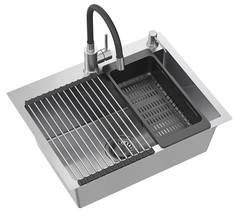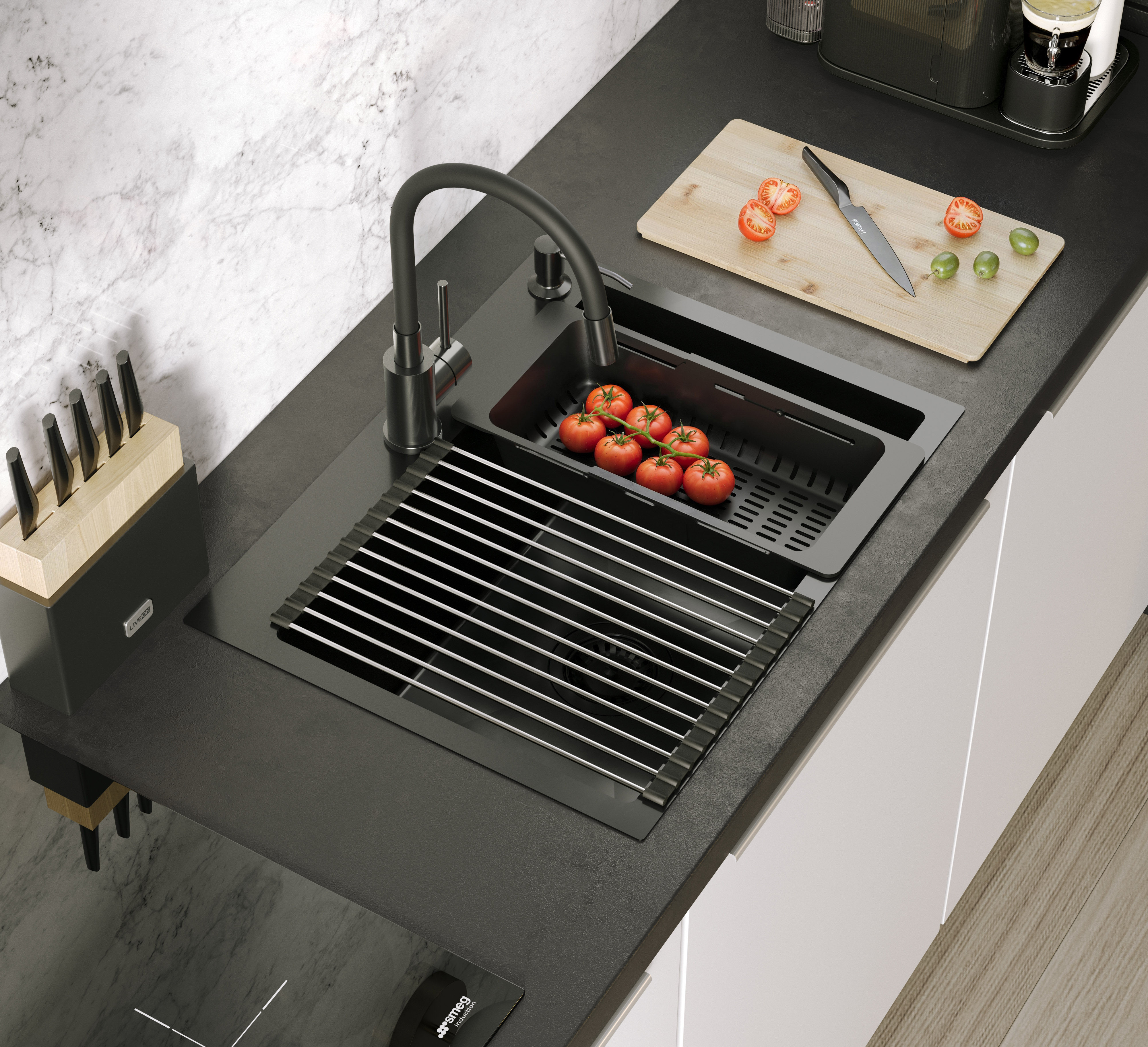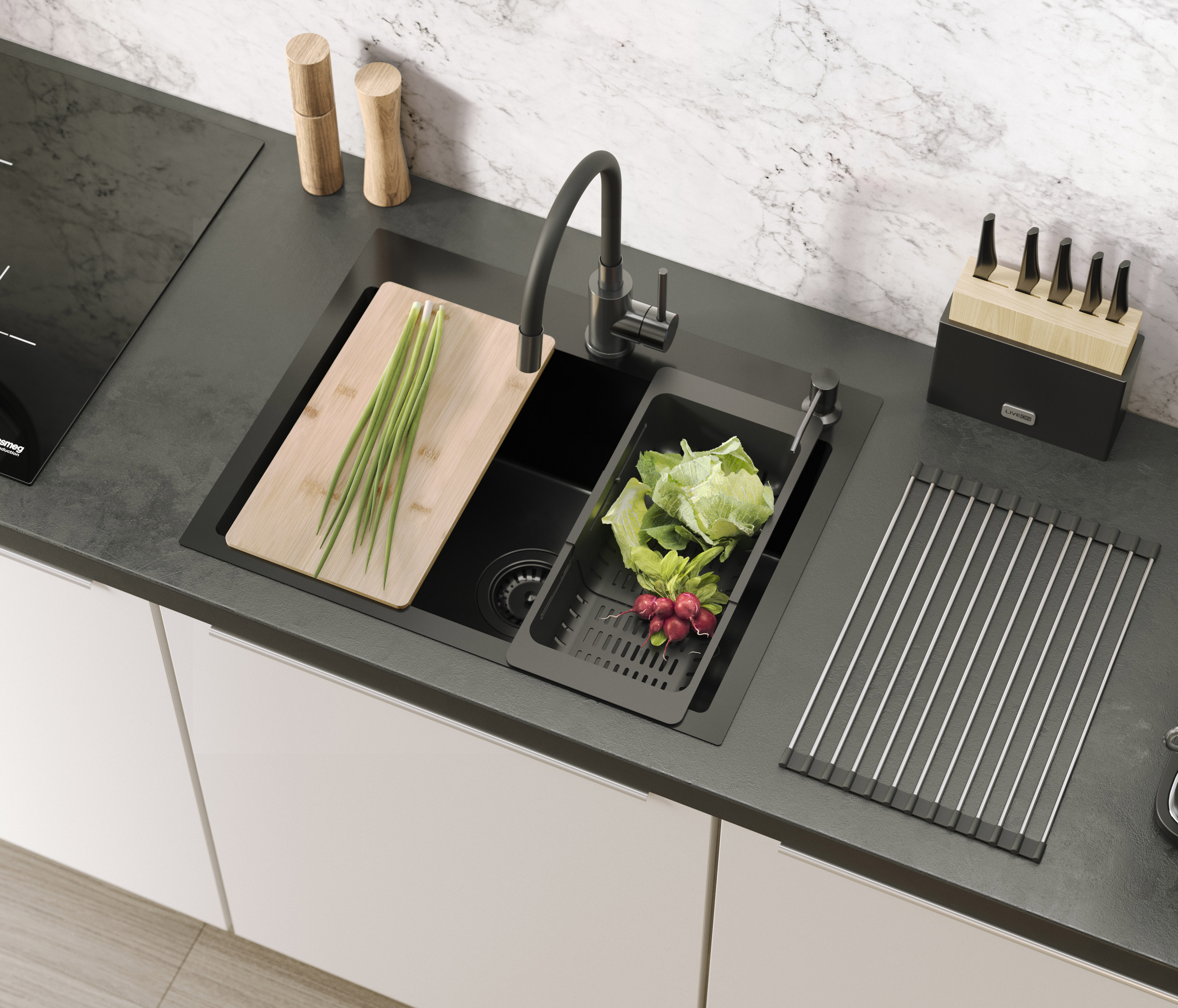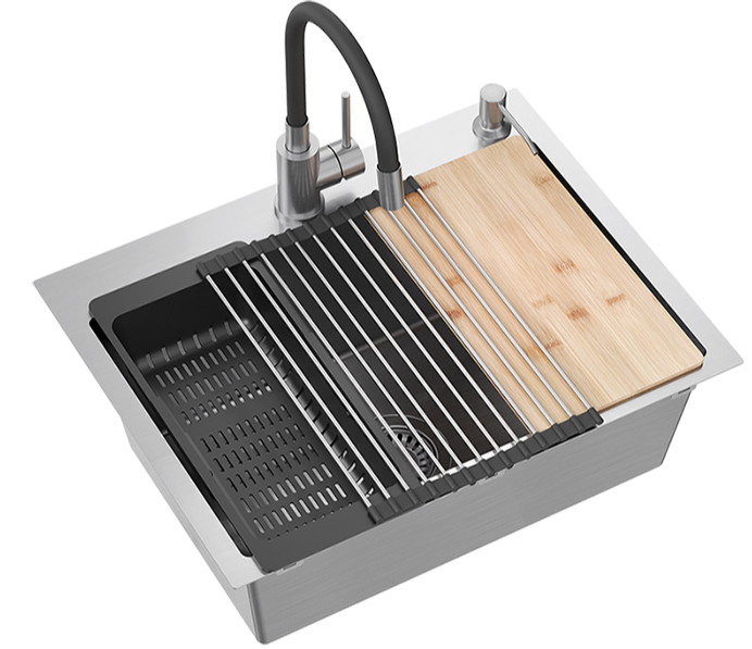Model wyposażony jest w syfon typu save space, dopasowane sitko odpływu oraz otwór na dozownik. W zestawie znajdują się praktyczne akcesoria, które zwiększają wygodę codziennej pracy: bambusowa deska do krojenia odporna na wilgoć, teleskopowa wkładka ociekowa umożliwiająca suszenie produktów oraz zwijana mata stalowo-silikonowa Qmata, która służy jako suszarka lub podstawka pod gorące naczynia.