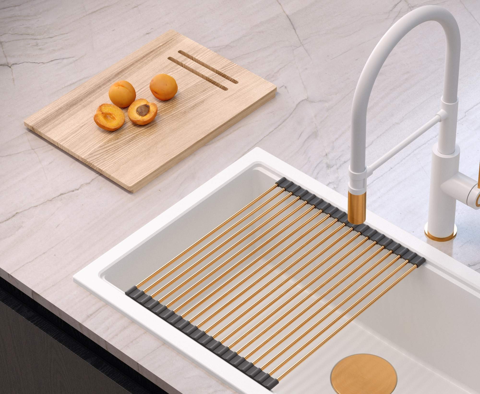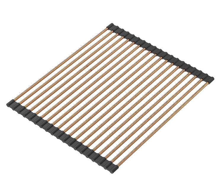 Qmata ociekowa Quadron w wersji PVD miedzianej 430 × 320 mm to eleganckie i funkcjonalne akcesorium, które łączy nowoczesny design z praktycznymi rozwiązaniami w strefie zmywania. Jej duży rozmiar pozwala wygodnie odsączać naczynia, płukać warzywa i owoce oraz pełni funkcję stabilnej podstawki pod gorące garnki, zwiększając komfort codziennej pracy w kuchni. Konstrukcja maty opiera się na solidnych stalowych pręcikach w miedzianym wykończeniu PVD, połączonych elastycznym silikonowym obrzeżem. Takie połączenie zapewnia trwałość, odporność na korozję, łatwość czyszczenia i estetyczny wygląd.