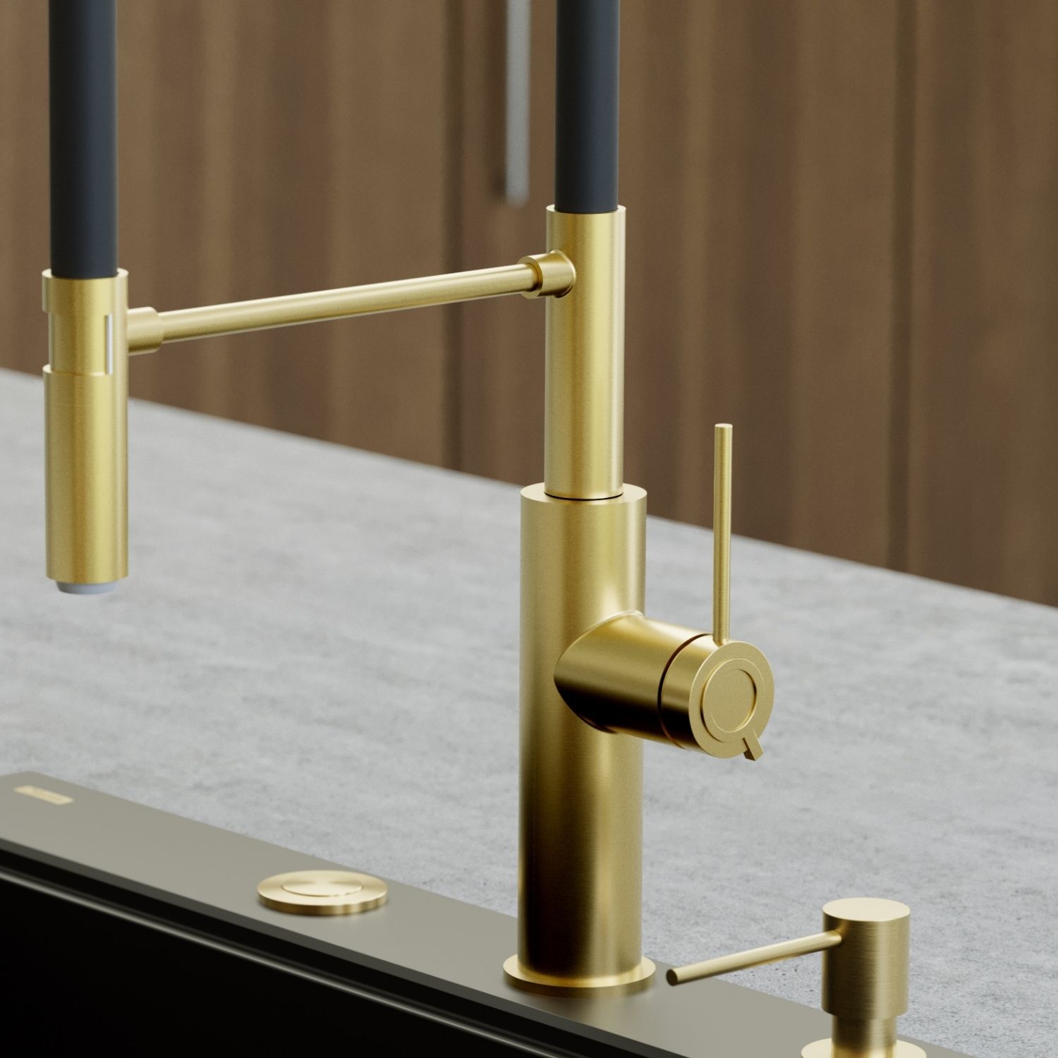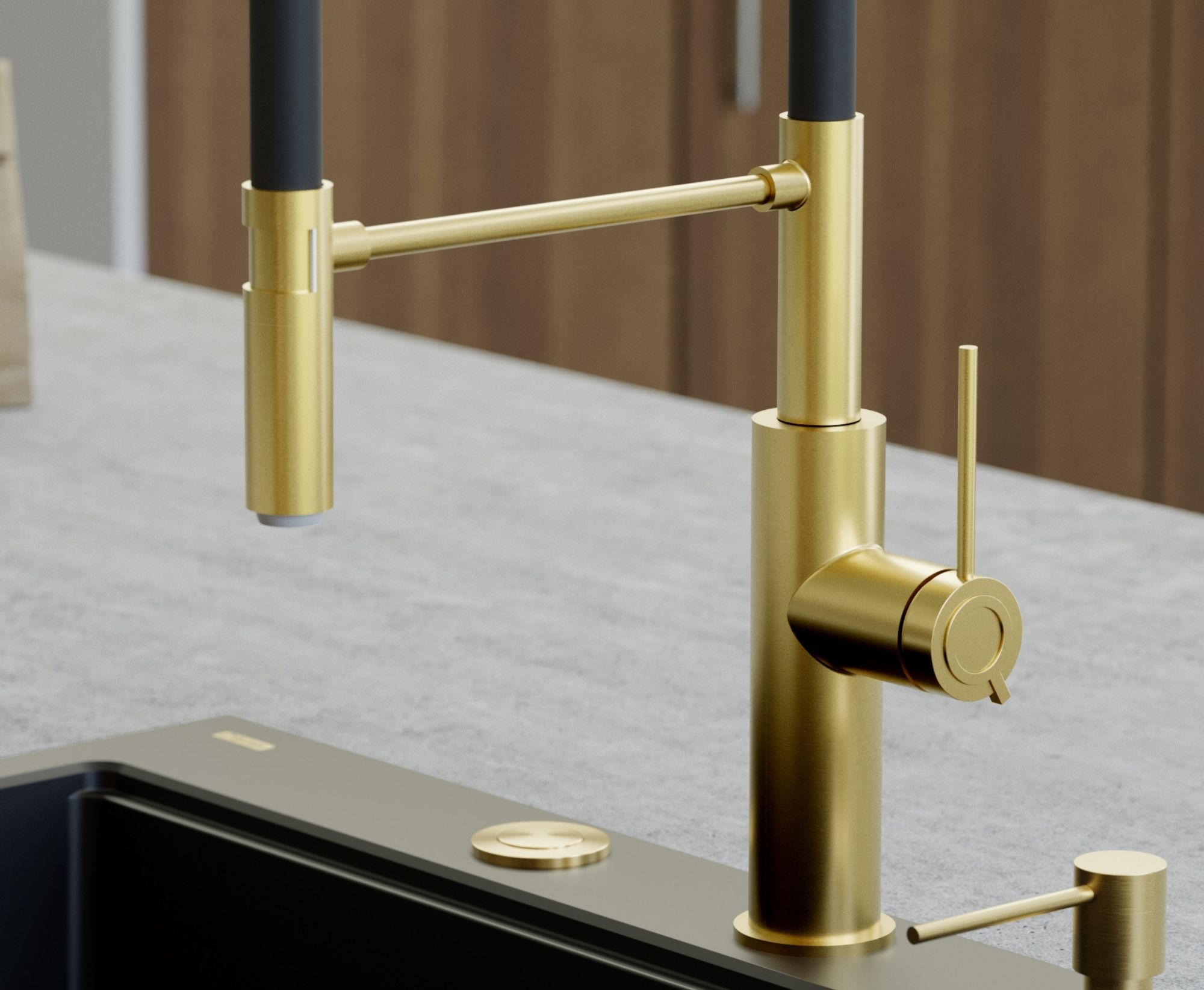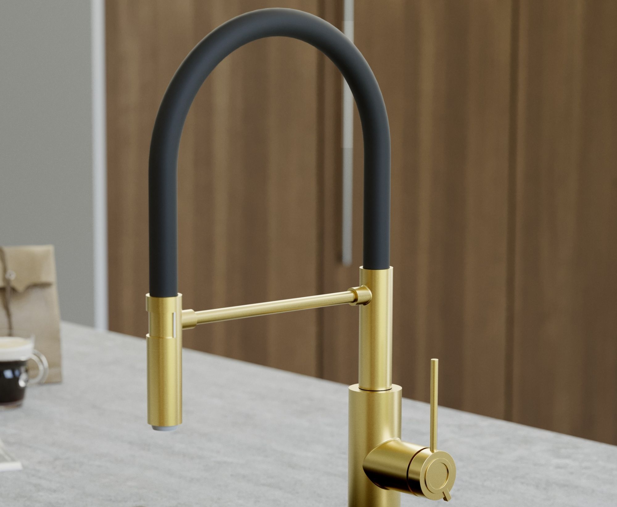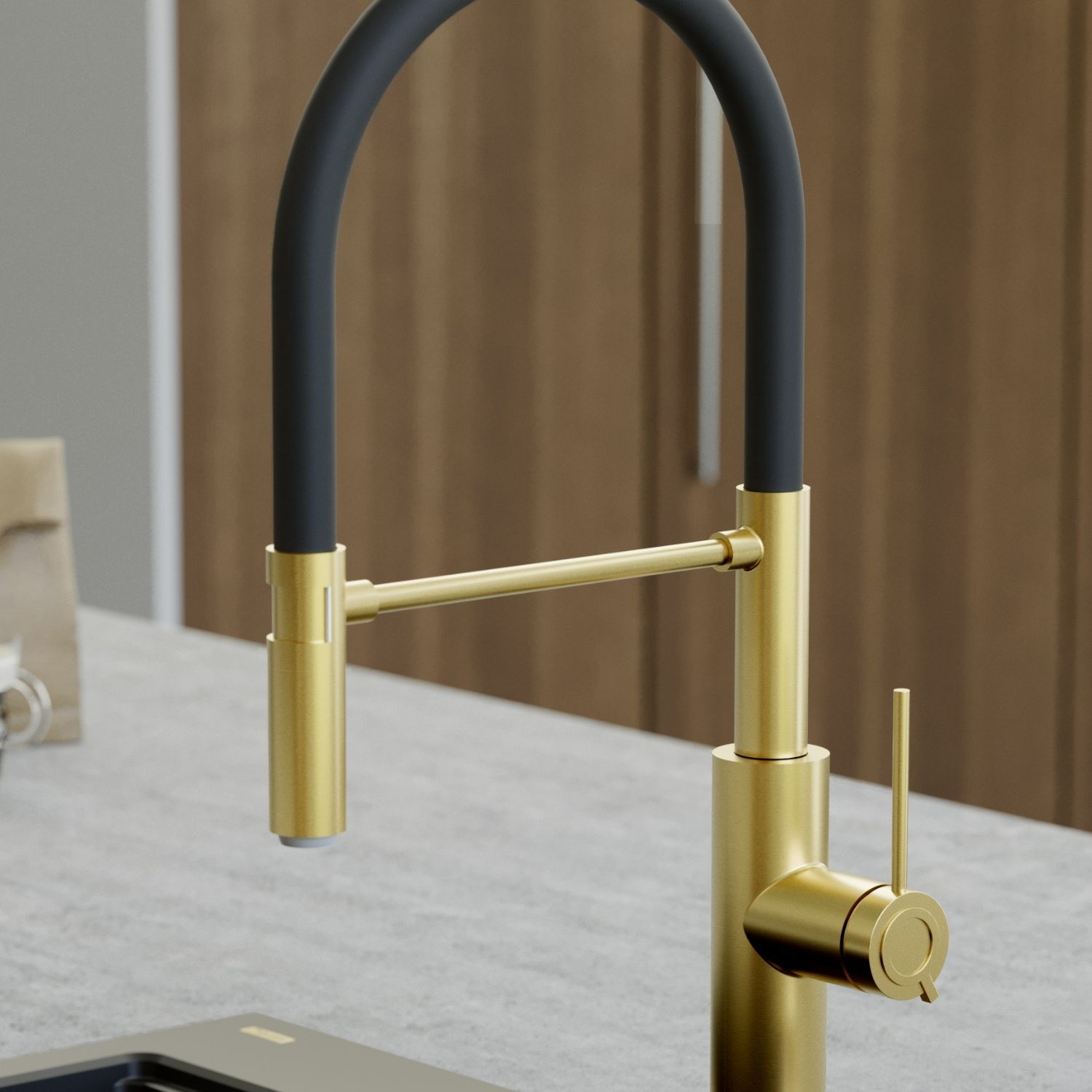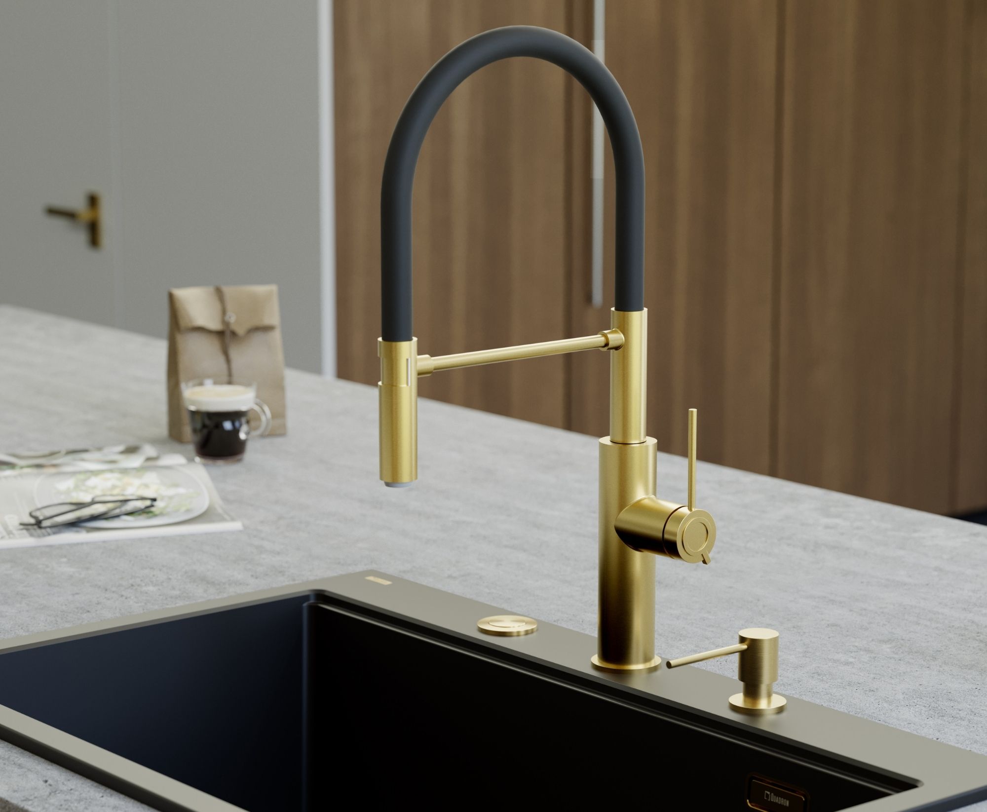 GEMMA Q LINE SteelQ bateria kuchenna z ruchomą wylewką Nano PVD gold (złota), czarny wąż. Bateria kuchenna GEMMA Q LINE SteelQ to połączenie nowoczesnego designu ze złotym wykończeniem Nano PVD i eleganckim, matowym czarnym wężem. Nagrodzona prestiżowym wyróżnieniem Red Dot Design Award 2022, zachwyca nie tylko formą, ale także funkcjonalnością. Wysoka sylwetka baterii nadaje wnętrzu wyrafinowany charakter, a subtelna biżuteryjna ozdoba na głowicy ceramicznej Sedal podkreśla jej luksusowy styl.