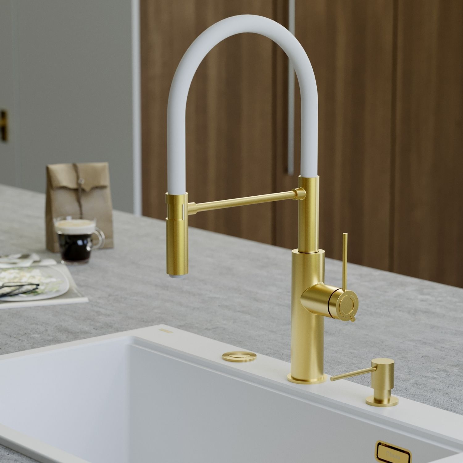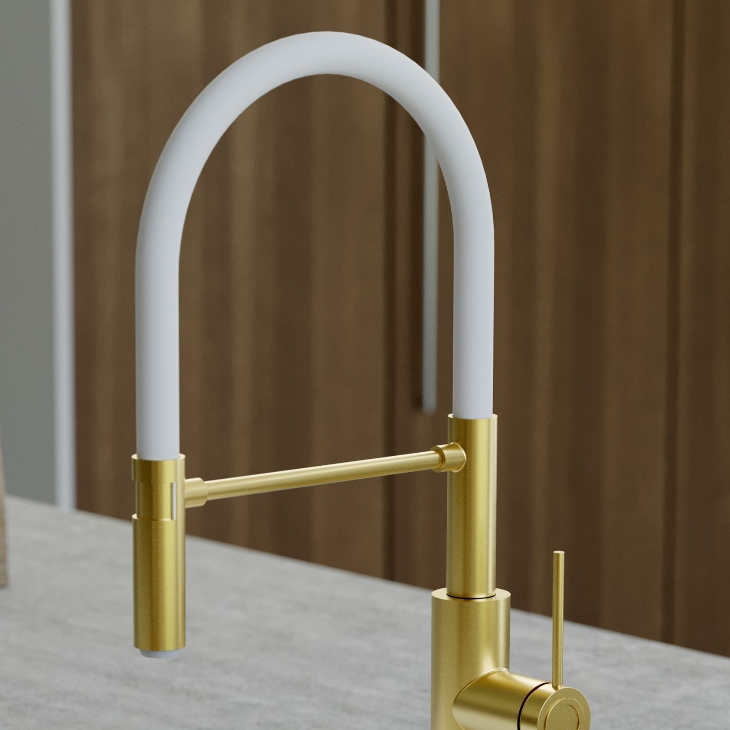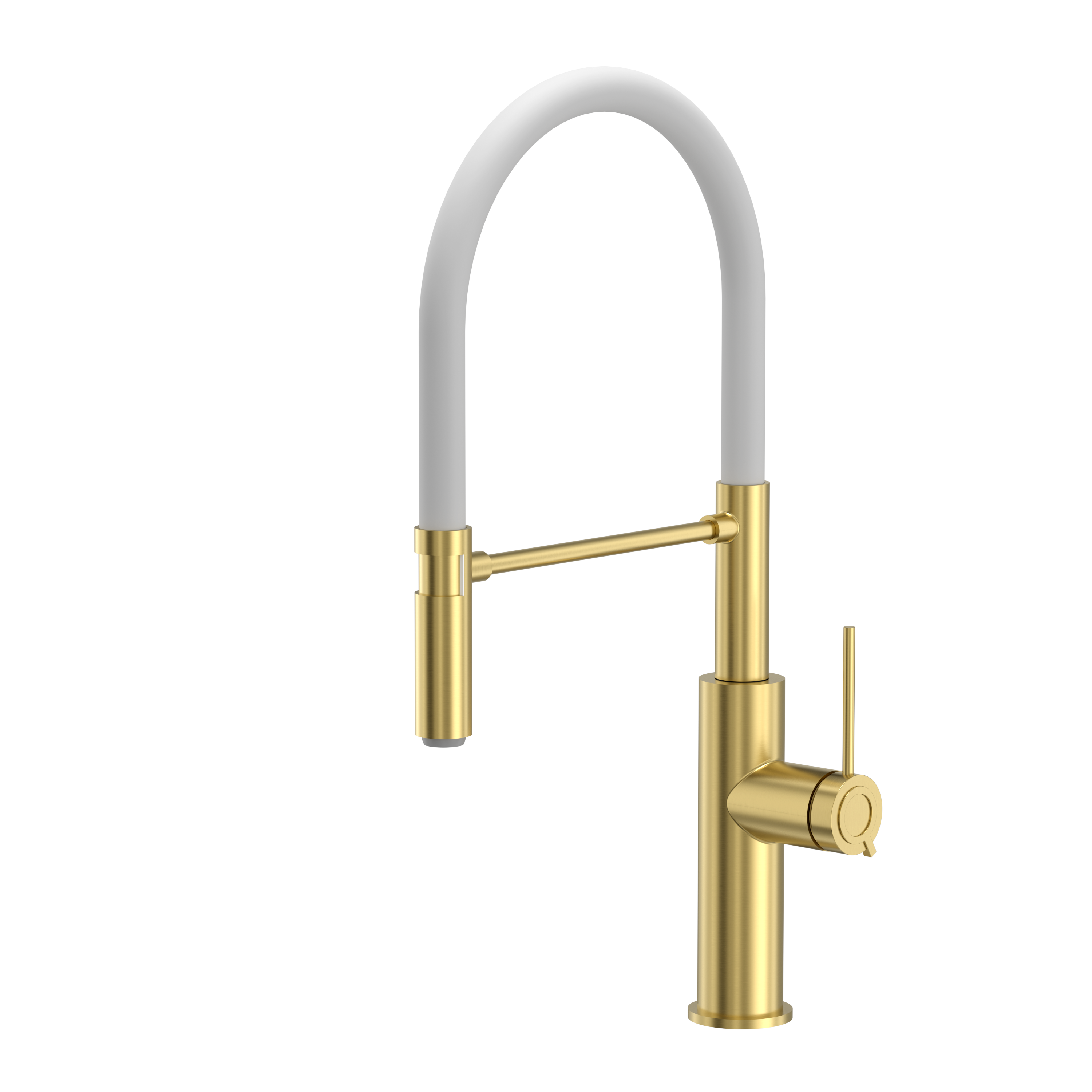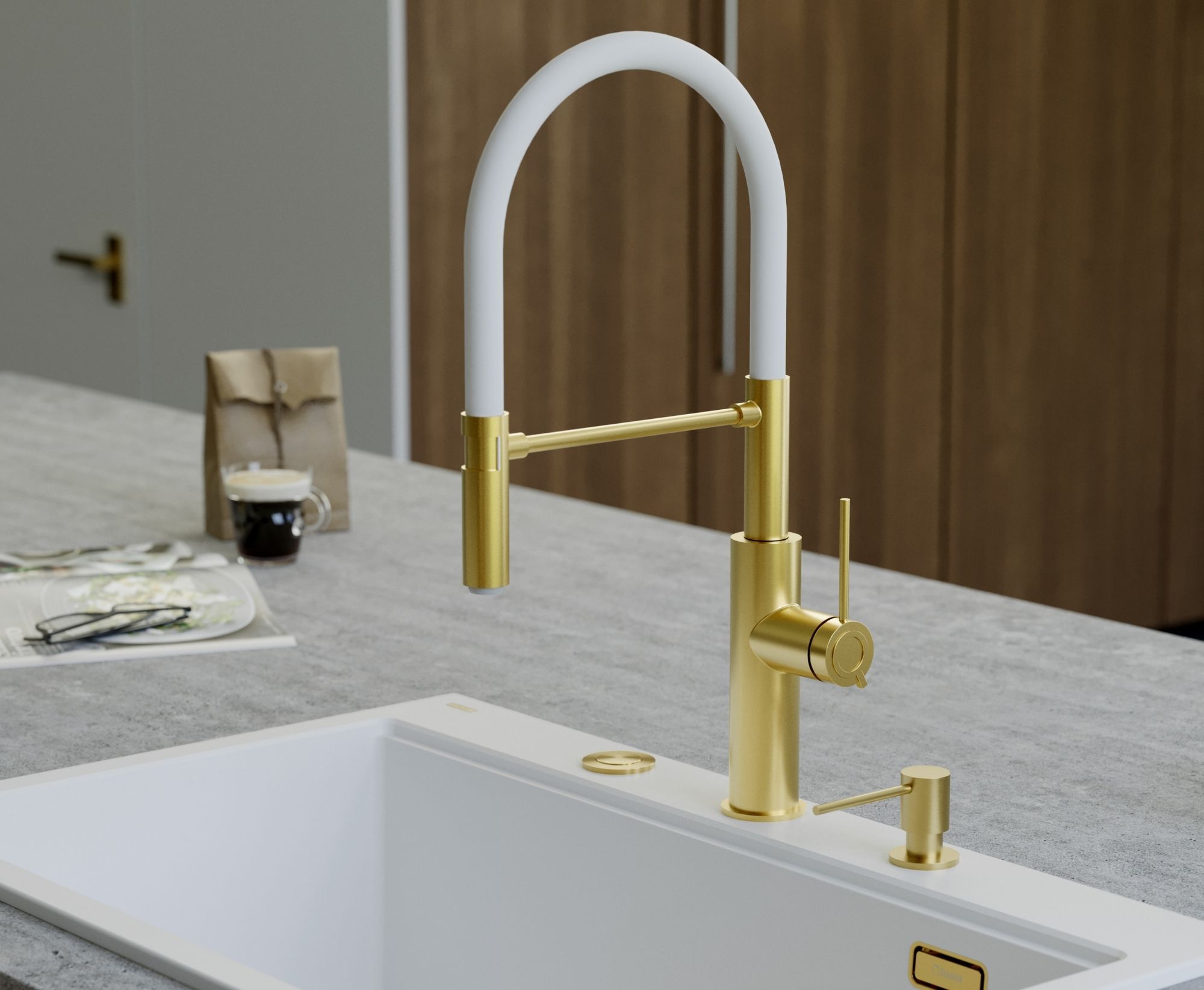 GEMMA Q LINE SteelQ bateria kuchenna z ruchomą wylewką Nano PVD gold (złota), biały wąż. Złota bateria kuchenna GEMMA Q LINE SteelQ w połączeniu z białym elastycznym wężem to wyjątkowa propozycja dla osób poszukujących połączenia elegancji i lekkości we wnętrzu. Wyróżniona nagrodą Red Dot Design Award 2022, jest symbolem nowoczesnego wzornictwa i wysokiej jakości wykonania.