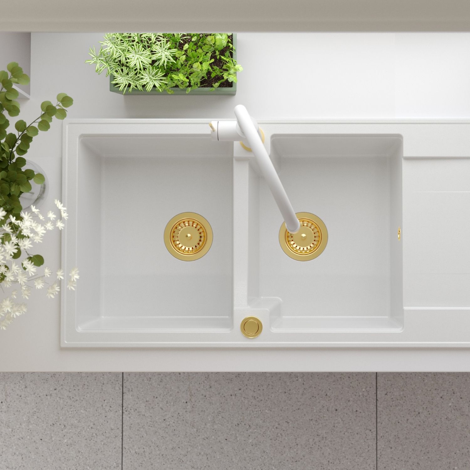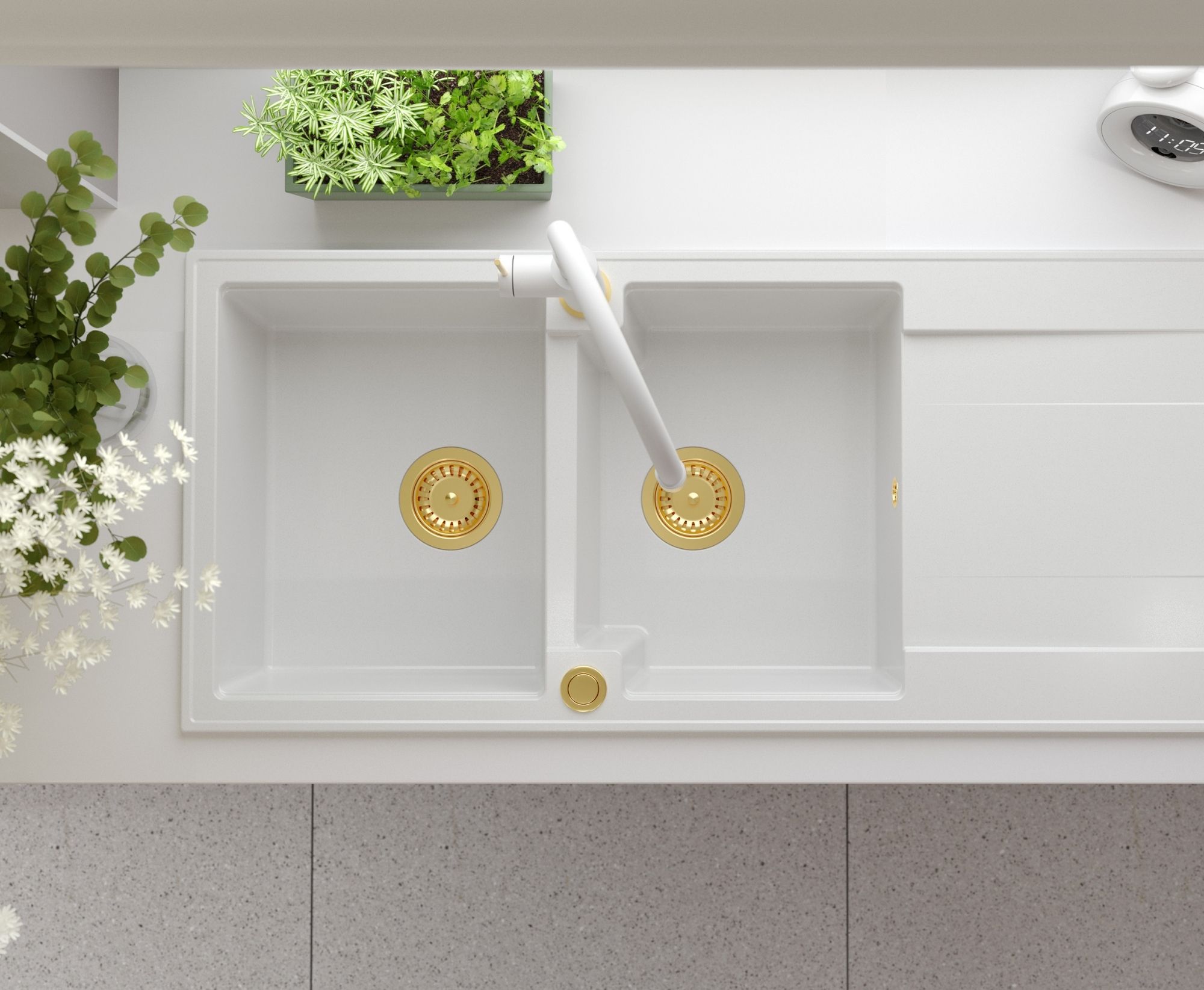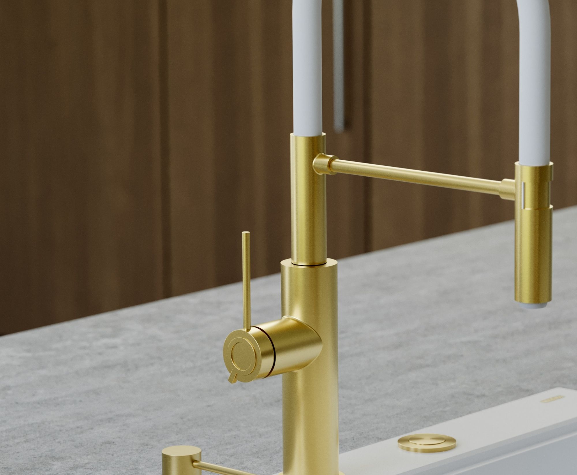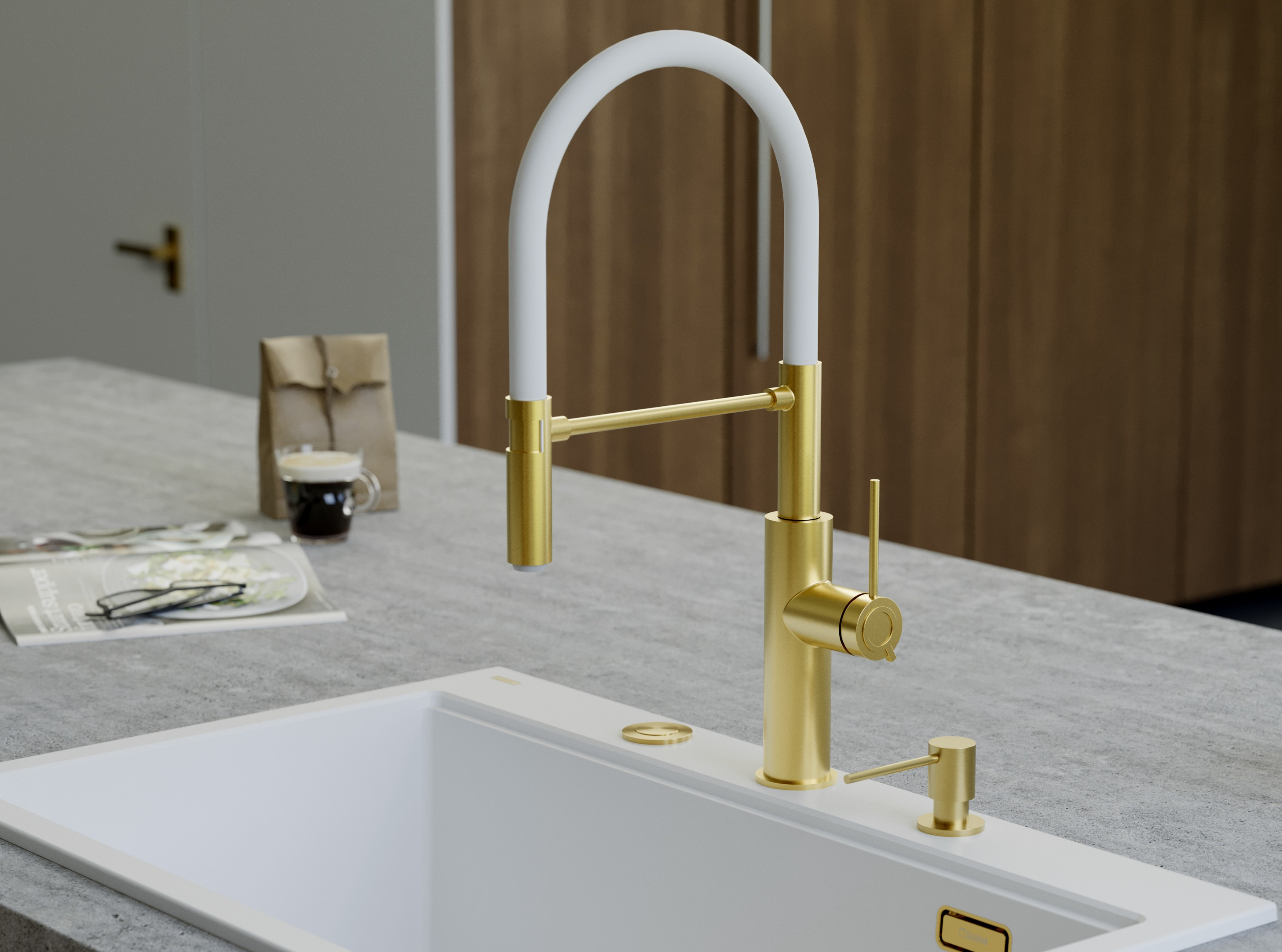 Smukła, wysoka forma baterii w wykończeniu Nano PVD gold doskonale komponuje się z jasnym akcentem węża, dodając kuchni świeżości i ponadczasowej klasy. Dwustopniowa głowica ceramiczna Sedal została ozdobiona subtelnym detalem biżuteryjnym, a jej cicha i niezawodna praca czyni codzienne korzystanie komfortowym. Ruchoma, elastyczna wylewka w białym kolorze pozwala swobodnie manewrować strumieniem wody, a magnetyczna podpora utrzymuje ją stabilnie nad zlewozmywakiem.
