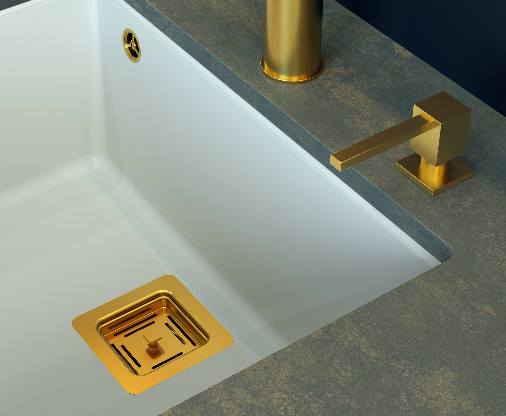 Kwadratowa forma główki wprowadza do kuchni nowoczesny i wyrafinowany akcent, doskonale komponujący się ze złotymi bateriami oraz detalami w tej samej tonacji.