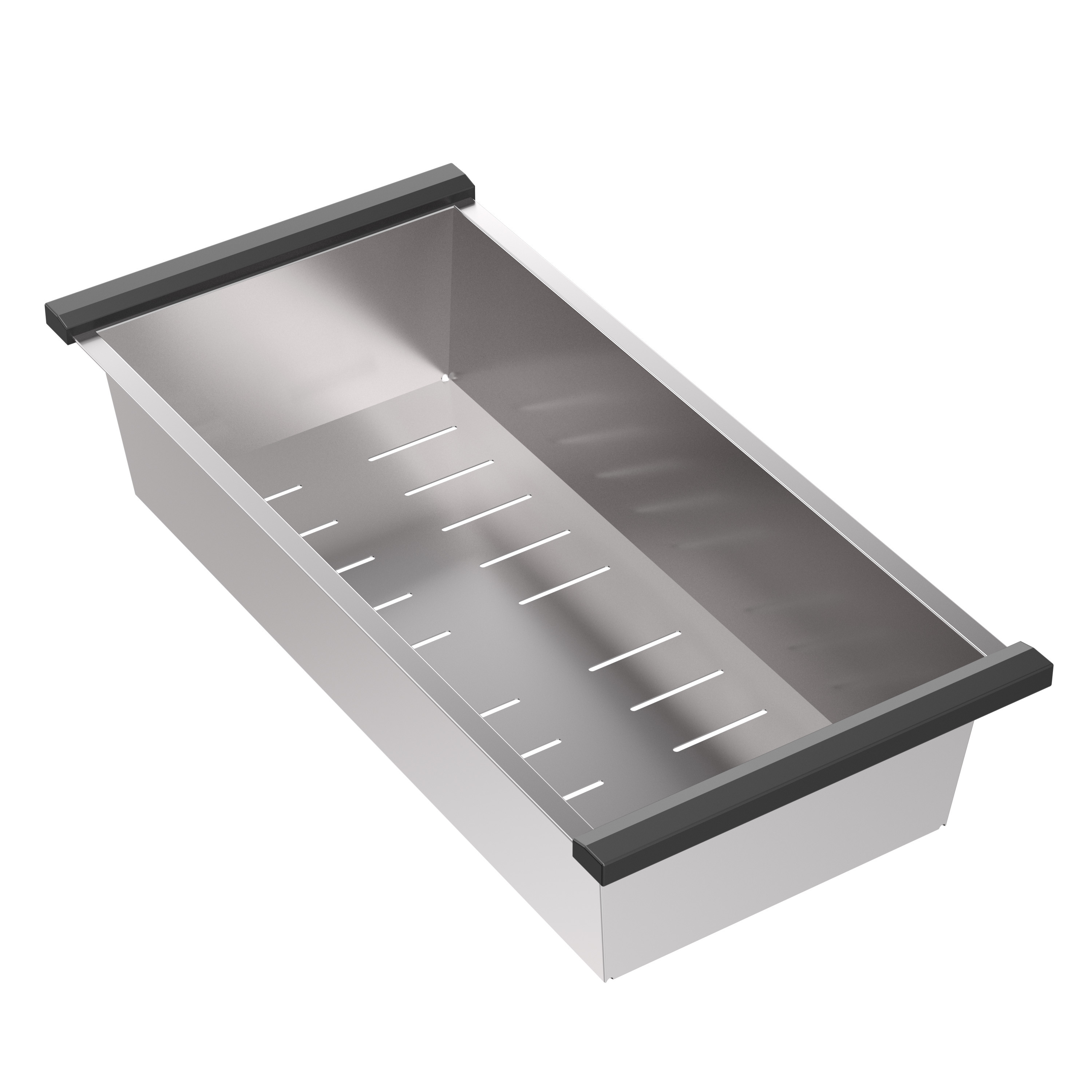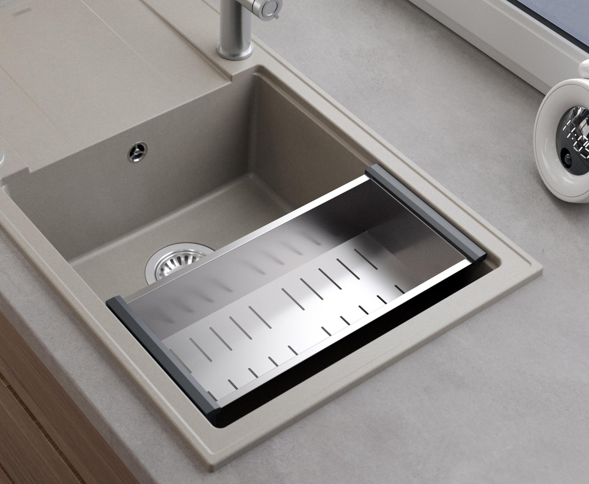 Doskonale sprawdza się jako miejsce do osączania umytych owoców, warzyw czy sztućców. Praktyczne uchwyty z tworzywa zabezpieczają brzegi produktu, ułatwiają jego przesuwanie oraz chronią zlew przed zarysowaniami. Solidna konstrukcja w połączeniu z prostą obsługą sprawia, że stalowa miska ociekowa jest wygodnym i trwałym dodatkiem do codziennego użytkowania. Jej wymiary zostały dopasowane do wielu modeli z oferty Quadron, takich jak: Evan 111, 121, 136, 146, 156, Morgan 110, Anthony 60, 80, Anthony 50, Nicolas, Patrick, Hugh 111, Hugh 116, Ralph, Kenneth, Ford 111. Dzięki uniwersalnemu rozmiarowi i starannemu wykonaniu wkładka ociekowa stanowi niezastąpione wyposażenie każdej kuchni, łącząc praktyczność z estetyką.