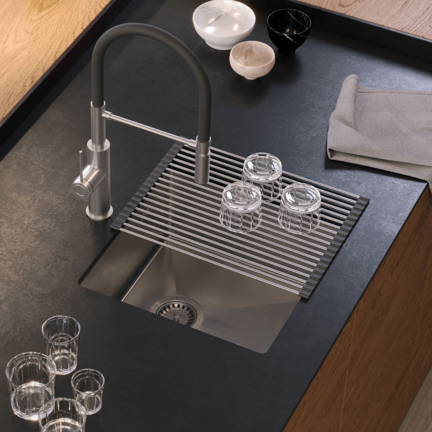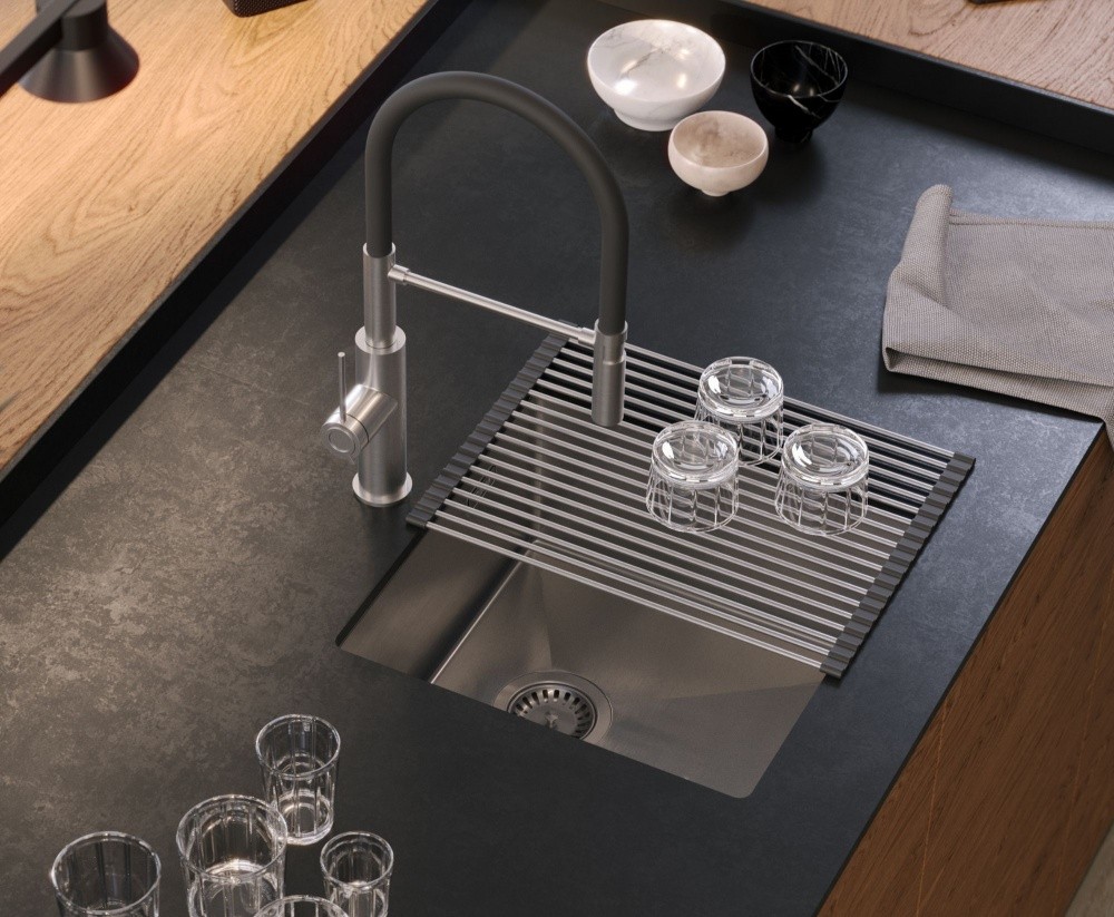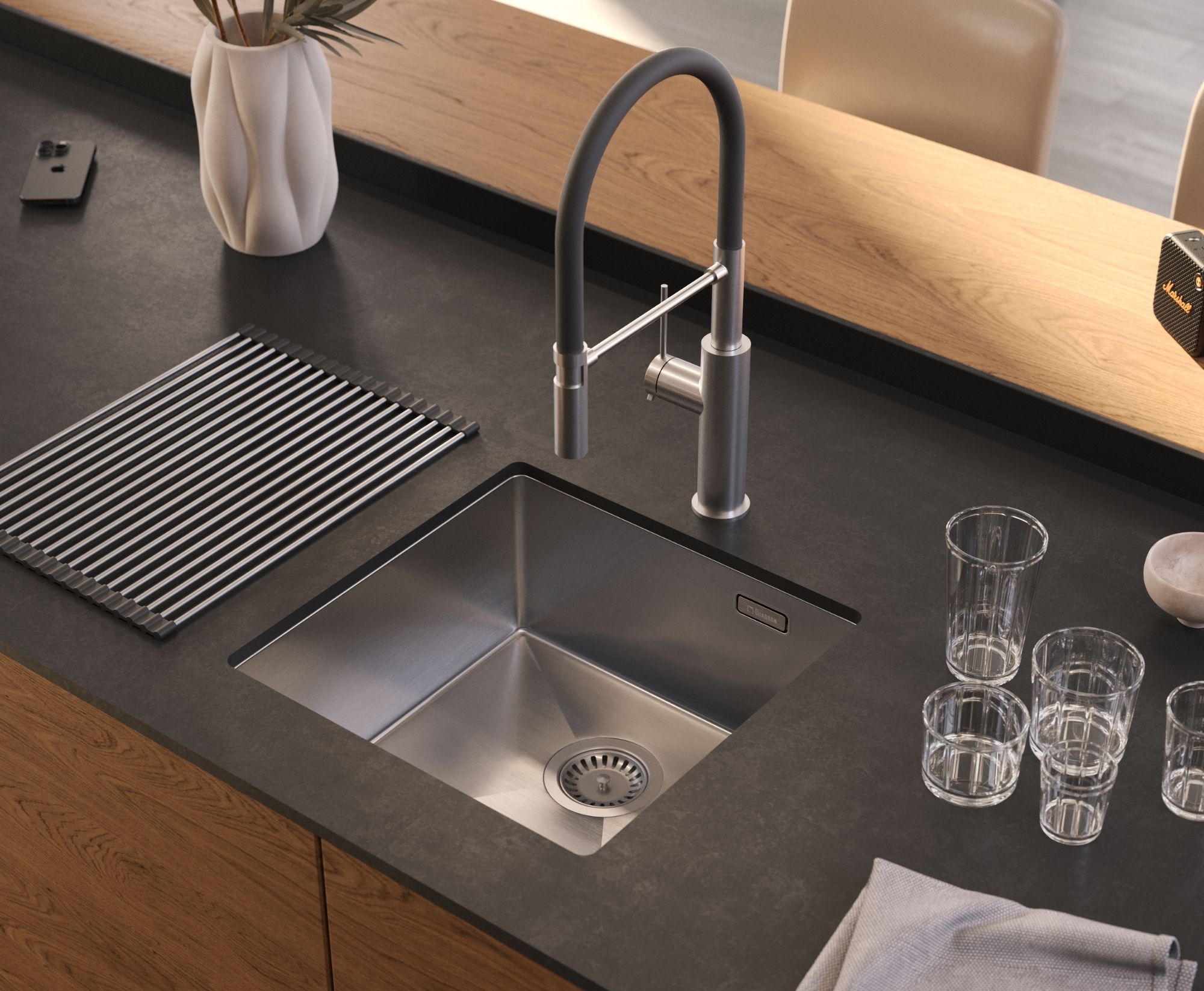 ANTHONY 50 stal szczotkowana można wzbogacić o akcesoria z oferty Quadron, jak stalowo-silikonowa Qmata, wkładka ociekowa czy deska do krojenia, które zwiększają funkcjonalność i komfort pracy w kuchni.