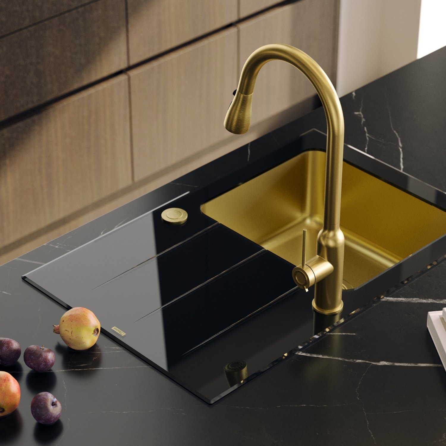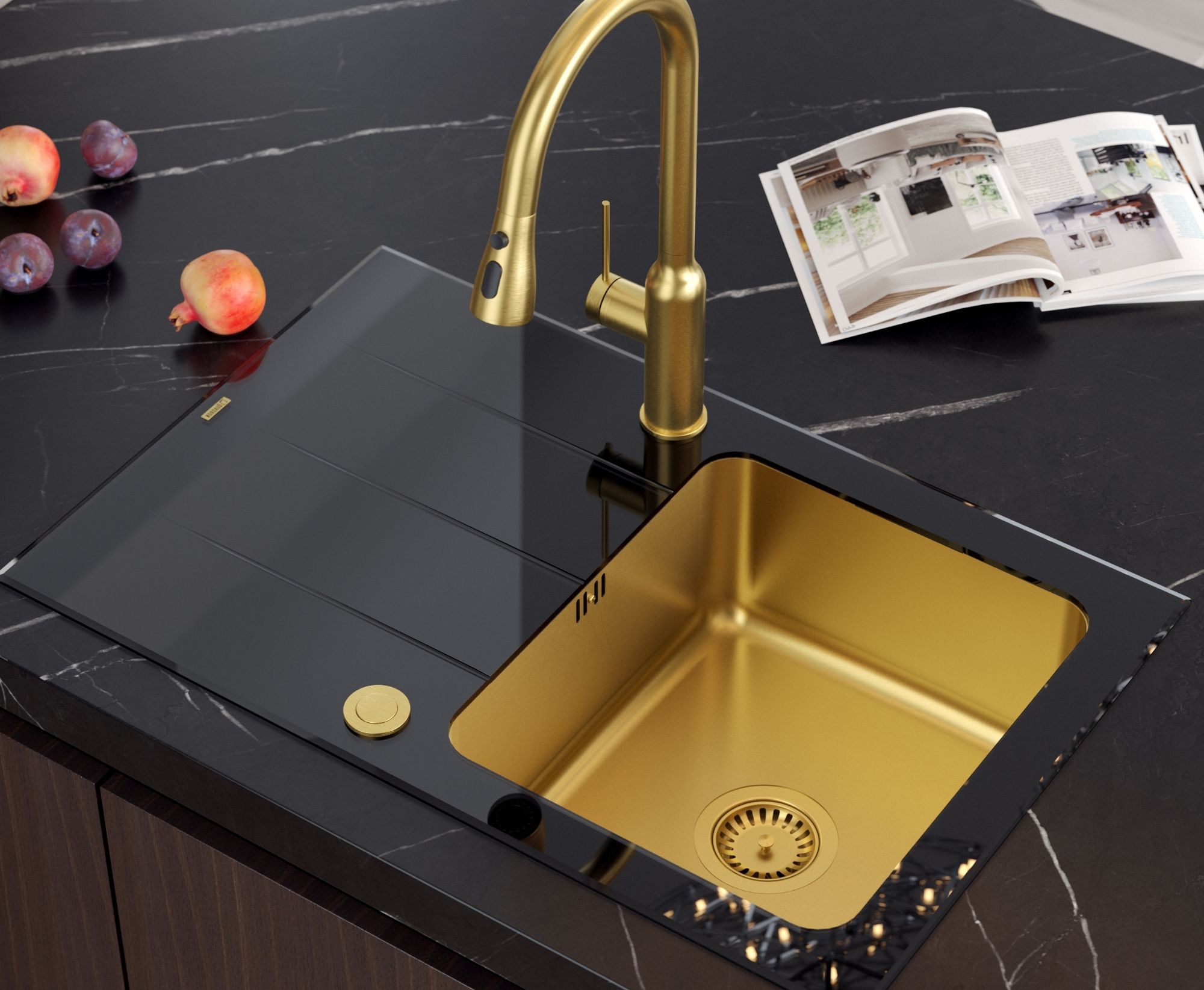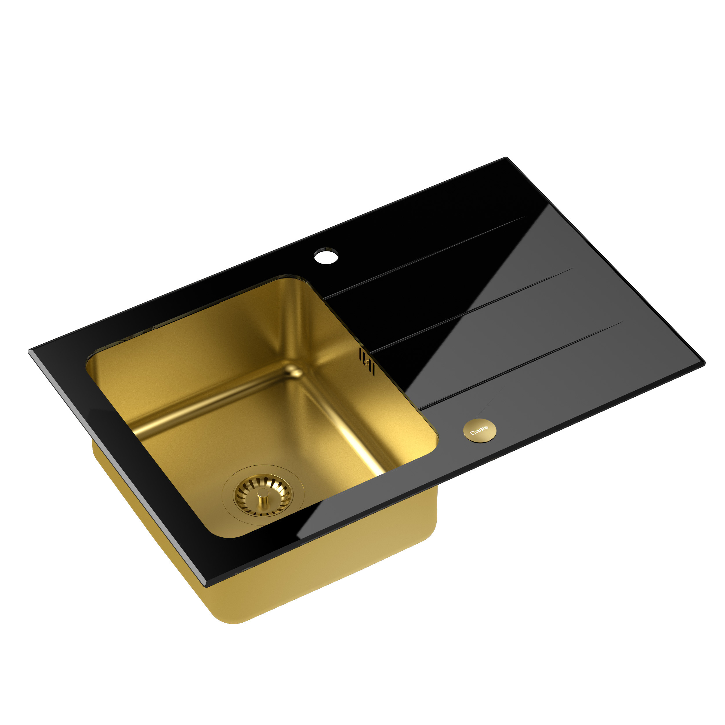 Zlewozmywak fusion FORD 111 – jednokomorowy, wpuszczany, czarne szkło hartowane/elementy złote, Quadron