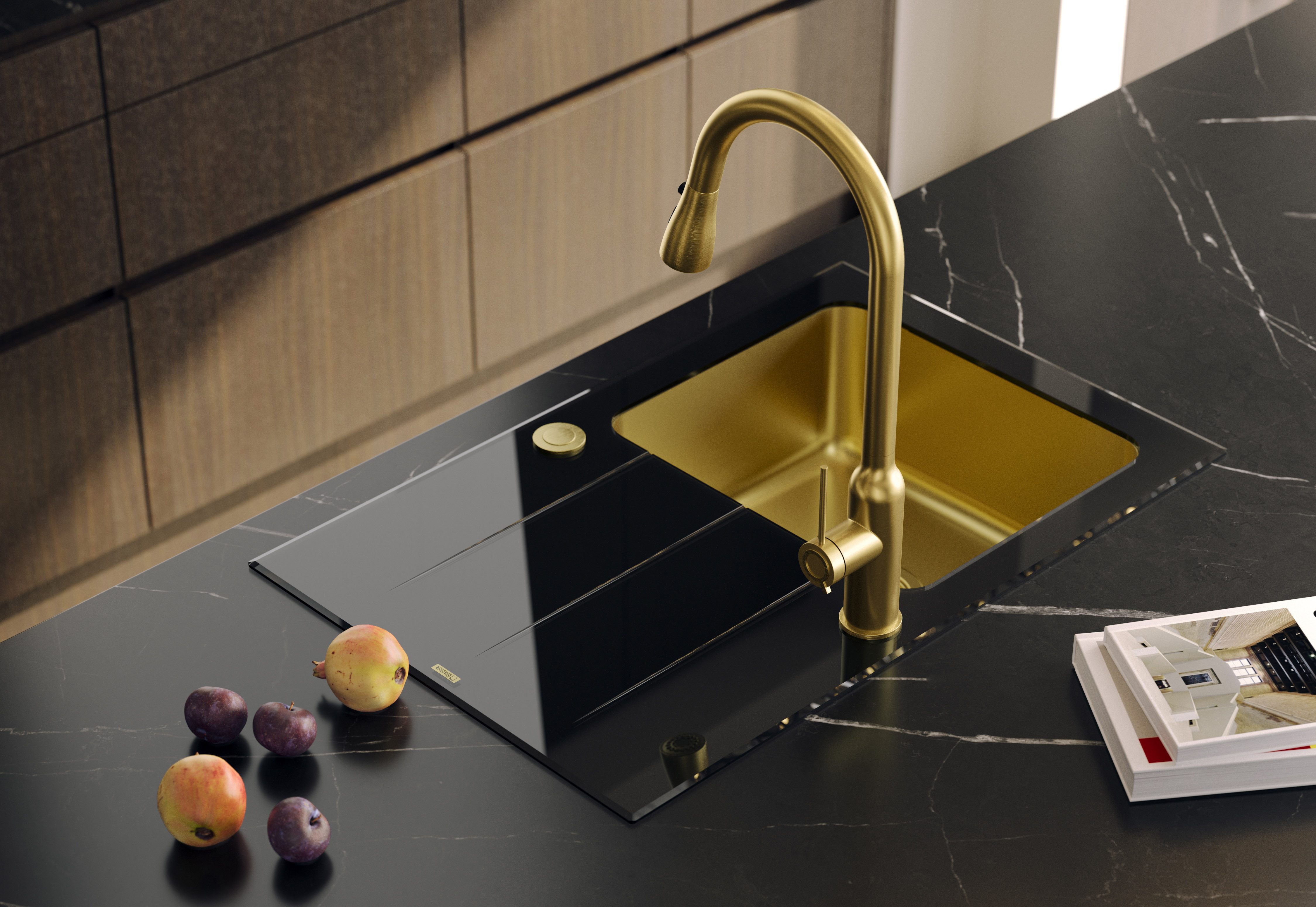 FORD 111 Fusion GlassQ to uniwersalny zlewozmywak łączący stalową komorę SteelQ w kolorze złotym z praktycznym ociekaczem z czarnego szkła hartowanego, zapewniający komfort codziennej pracy w kuchni. Ociekacz wyposażono w subtelne żłobienia, które skutecznie odprowadzają wodę do komory, chroniąc blat przed rozlewaniem, a przestronny rozmiar komory umożliwia wygodne mycie naczyń i garnków. Zlew można łatwo dopasować do różnych układów kuchennych, tworząc funkcjonalną strefę zmywania.