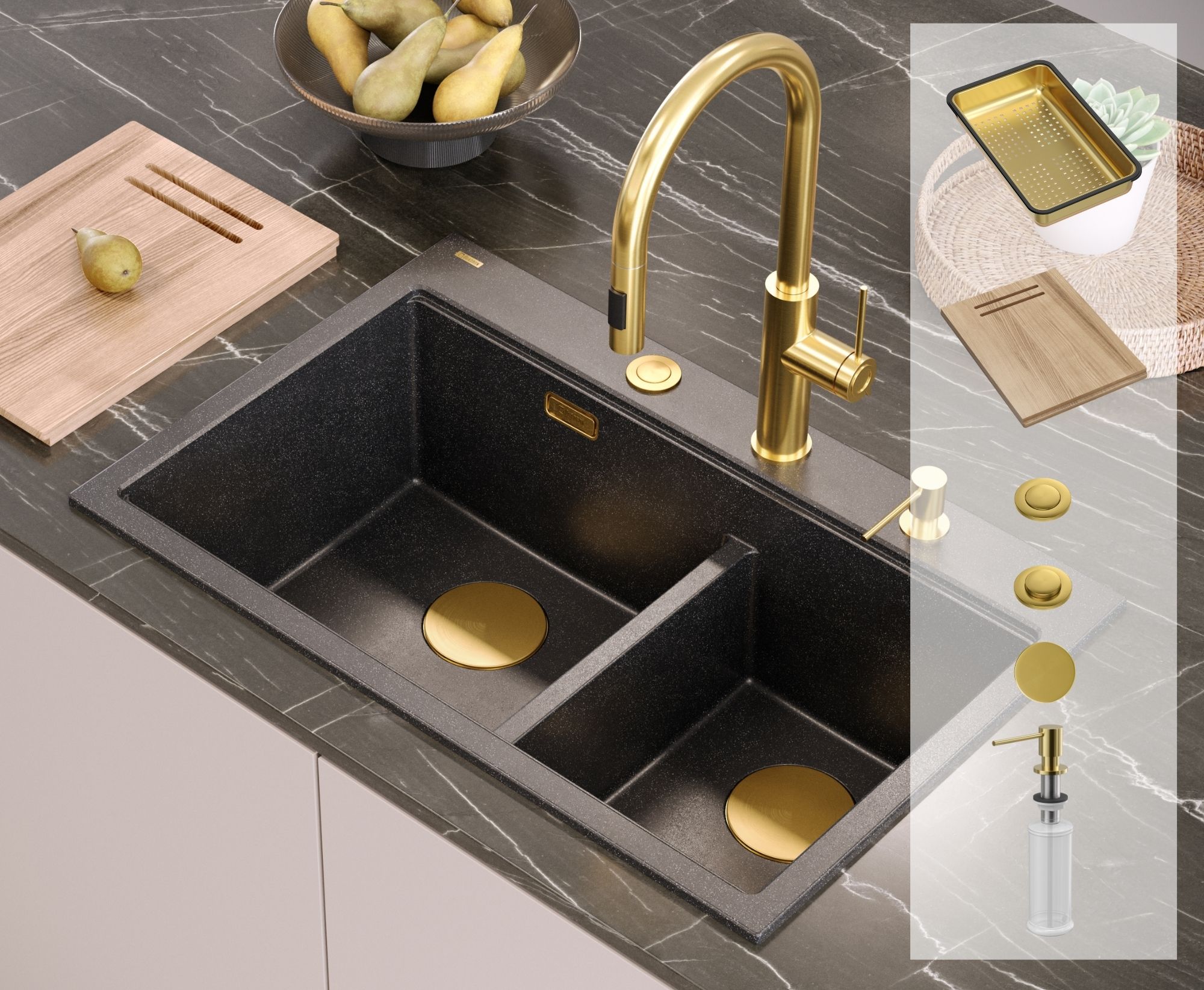 W zestawie ze zlewozmywakiem MARC 120 ze złotymi elementami znajdują się: syfon Push-2-Open, jesionowa deska do krojenia, stalowa wkładka ociekowa, dozownik płynu oraz nakładka na odpływ. Praktyczne akcesoria znacząco ułatwiają pracę w kuchni.