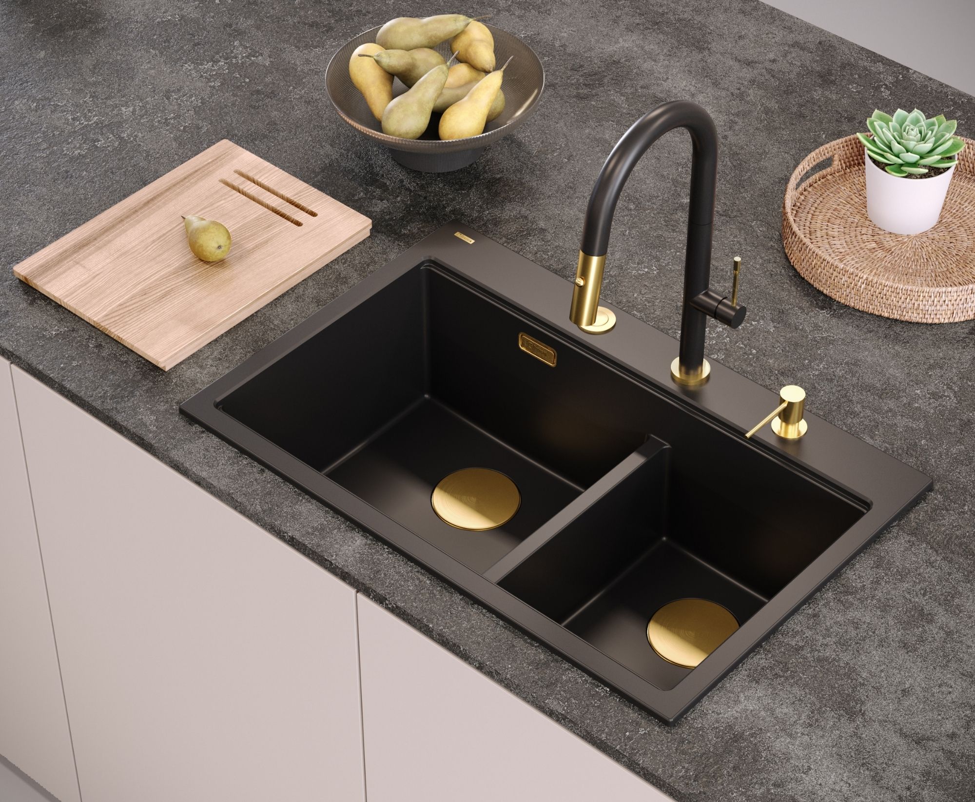 MARC 120 Workstation w odcieniu szarości silver stone z elementami w kolorze złota to dwukomorowy zlewozmywak granitowy łączący pojemność z nowoczesnym designem.