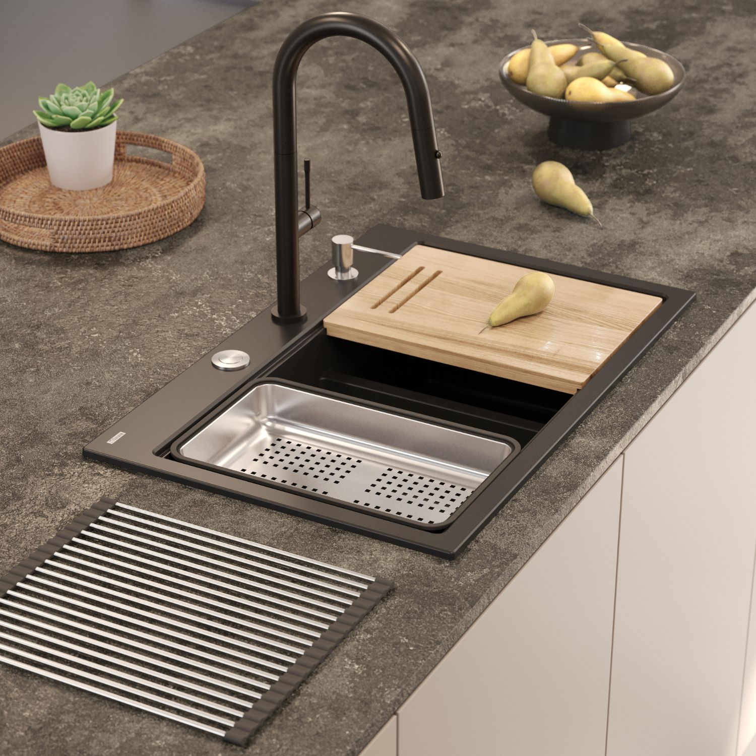 Syfon Push-2-Open umożliwia wygodne otwieranie i zamykanie odpływu bez użycia rąk, jesionowa deska do krojenia idealnie dopasowuje się do komory, tworząc dodatkową przestrzeń roboczą, a stalowa wkładka ociekowa pozwala na wygodne płukanie i odsączanie warzyw, owoców czy naczyń. Dozownik płynu do mycia naczyń oraz nakładka na odpływ dbają o estetykę i porządek w strefie zlewu.