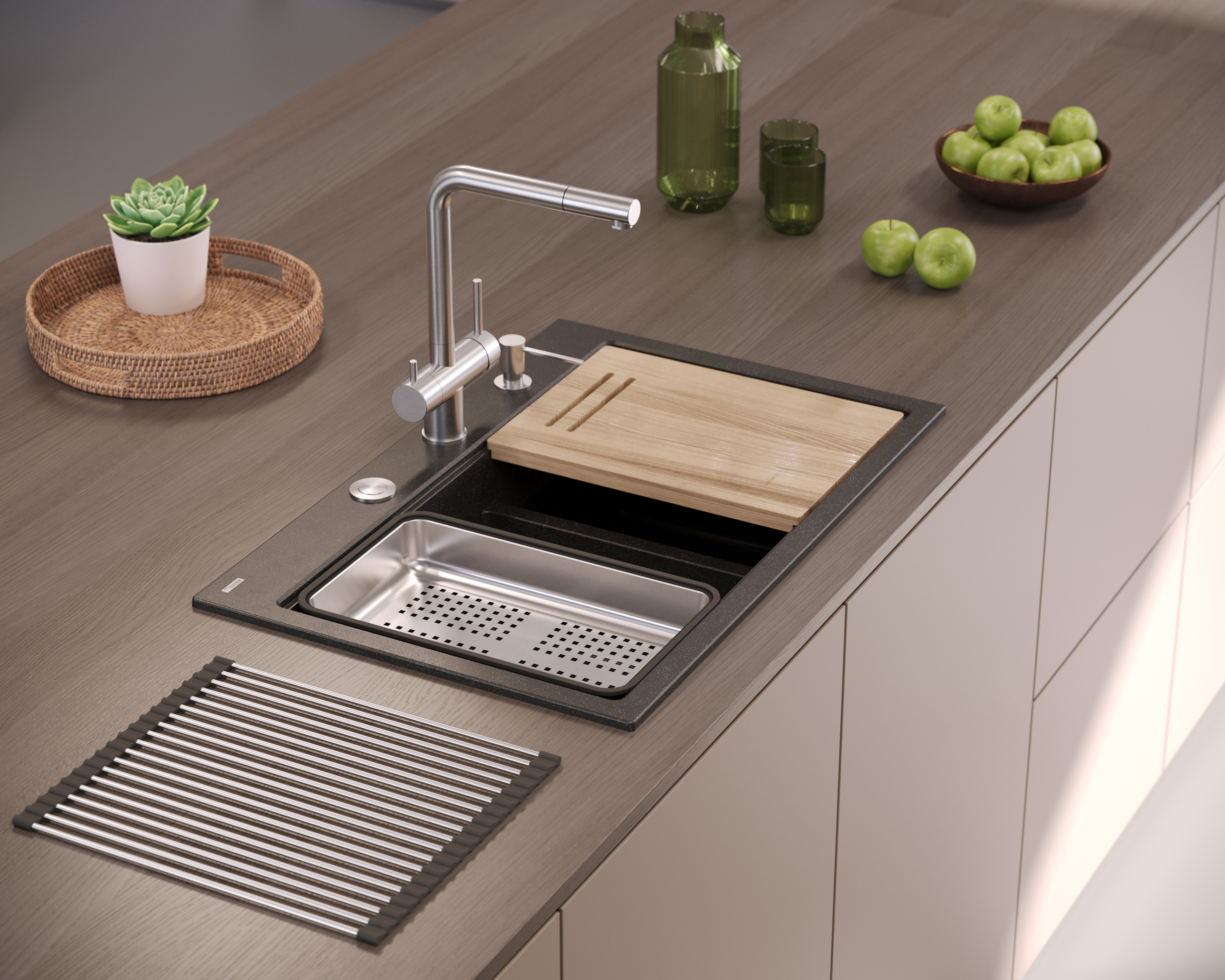 Syfon Push-2-Open umożliwia wygodne otwieranie i zamykanie odpływu bez użycia rąk, jesionowa deska do krojenia idealnie dopasowuje się do komory, tworząc dodatkową przestrzeń roboczą, a stalowa wkładka ociekowa pozwala na wygodne płukanie i odsączanie warzyw, owoców czy naczyń. Dozownik płynu do mycia naczyń oraz nakładka na odpływ dbają o estetykę i porządek w strefie zlewu.