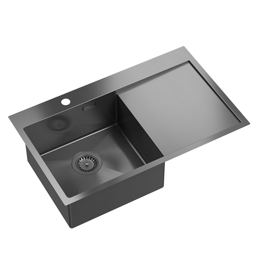 RUSSEL 111 SteelQ to jednokomorowy zlewozmywak ze stali nierdzewnej w kolorze grafitowym, wyposażony w szeroki ociekacz, który zapewnia wygodną i ergonomiczną strefę zmywania. Obszerna komora umożliwia komfortowe mycie dużych naczyń, garnków czy akcesoriów kuchennych, a ociekacz stanowi praktyczne miejsce do suszenia i odkładania produktów. Model dostępny jest z komorą po prawej stronie, co pozwala dopasować ustawienie zlewu do układu kuchni.